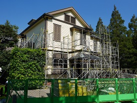 1910年に当時の外交官、内田氏の住宅として東京都渋谷区に建てられたものですが、平成9年にここ山手イタリア山庭園に移築復元され一般公開されています。現在は外壁塗装がかなり傷んだ為補修工事が始まり足場が建てられていますが、内部は通常に見学する事が出来当時の外交官の暮らしが体験出来ます。