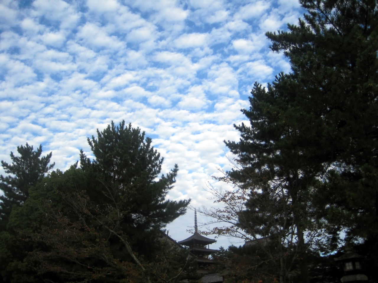 - この五重の塔は四季折々の空の下でいろんな顔を見せるだろうが、秋のうろこ雲の下では特別に良く映える。