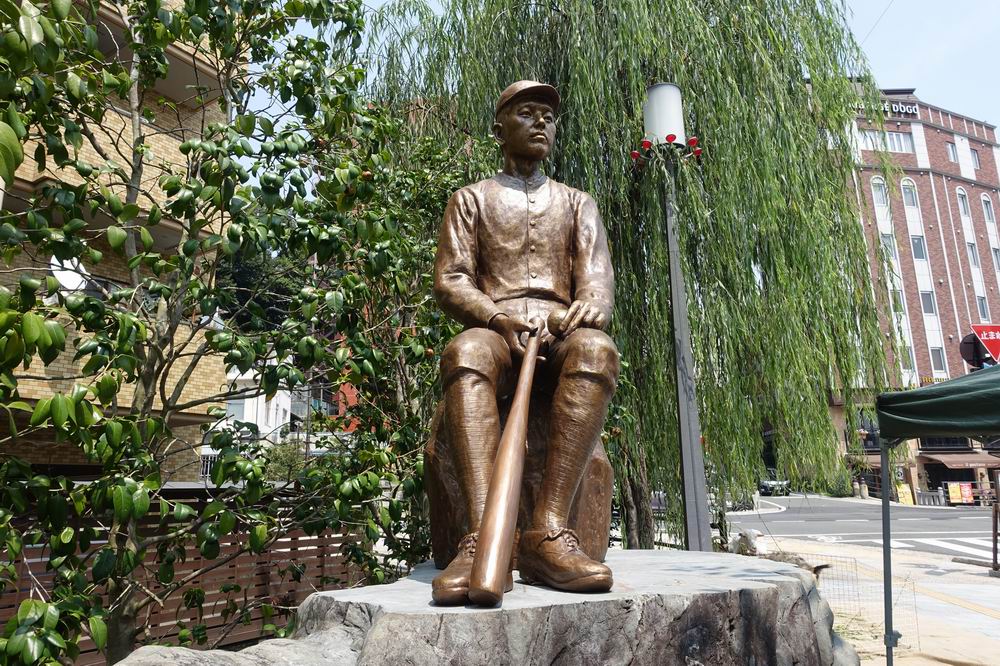 肝心の銅像ですが、野球のユニフォーム姿の正岡子規で手にバットとボールを持っています。背中の名前は「M.NOBORU」となっていました。