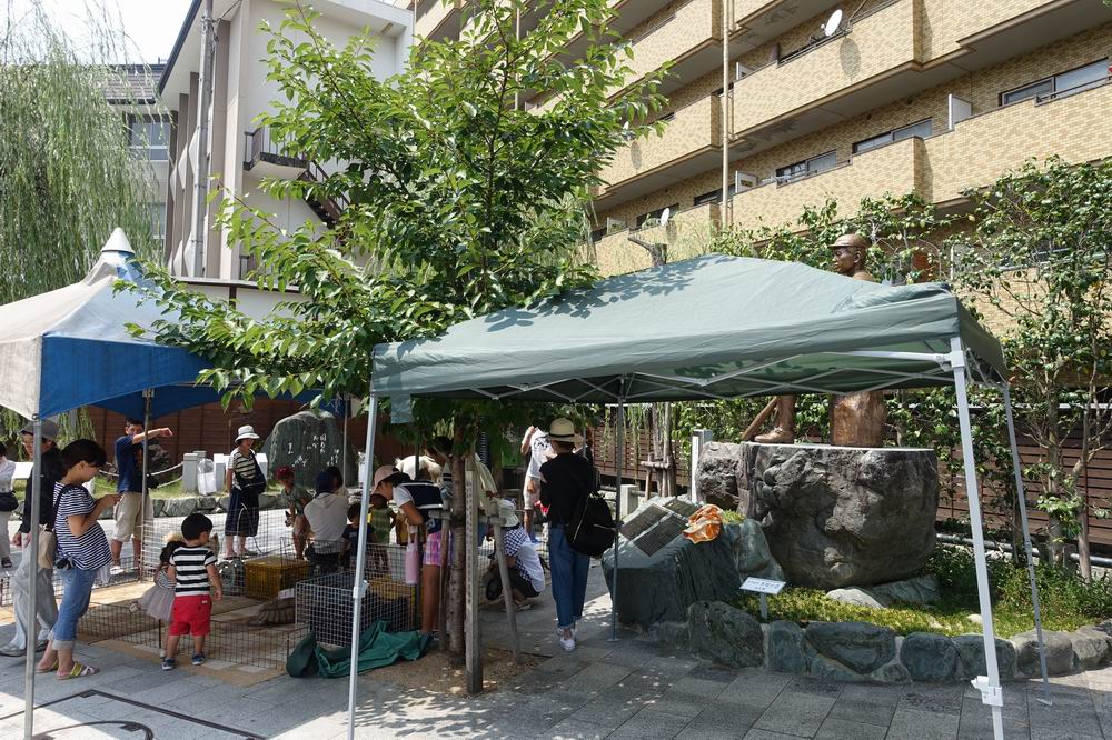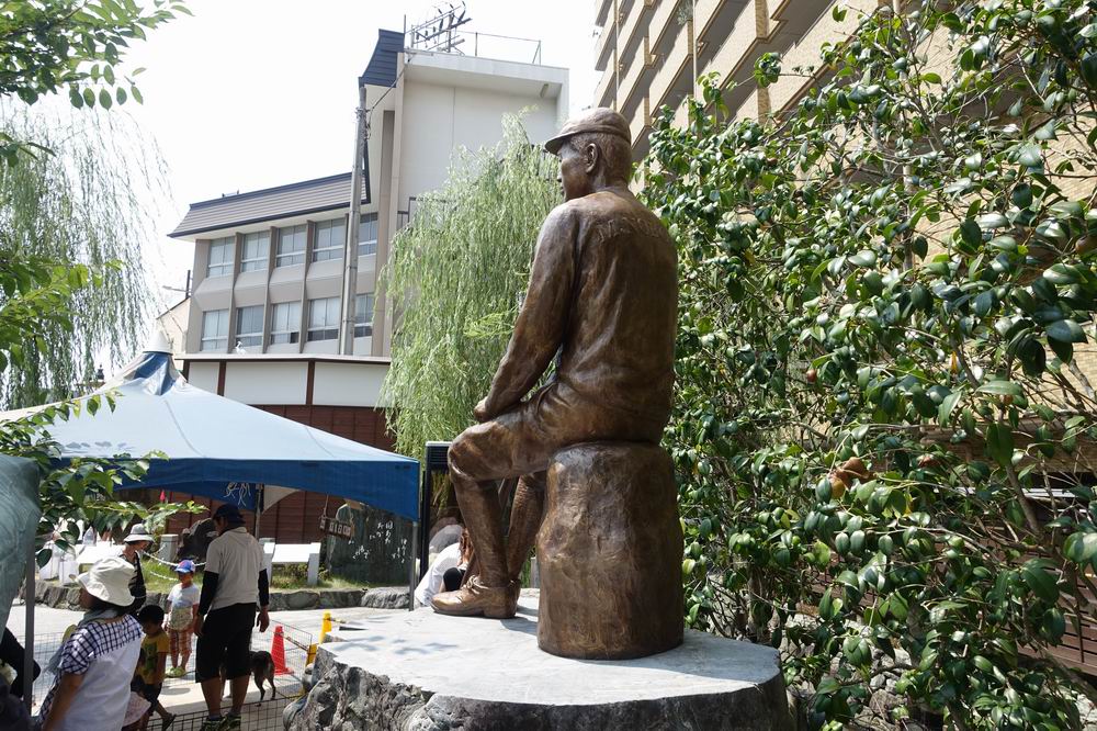 道後温泉駅を出ると正面にハイカラ通りの入口とその右にからくり時計が目に入ります。正岡子規像はからくり時計のさらに奥、放生園と呼ばれる一画にありました。調べたところ、2015年3月に除幕式が行われたまだ新しい銅像のようです。訪れた時はちょうど夏祭中で、子規像の前に動物コーナーのテントが張られ、見えにくくなっていました。テントの向こうに回ってようやく銅像が見える感じで… 祭も大事ですがもうちょっと配慮がほしいです。