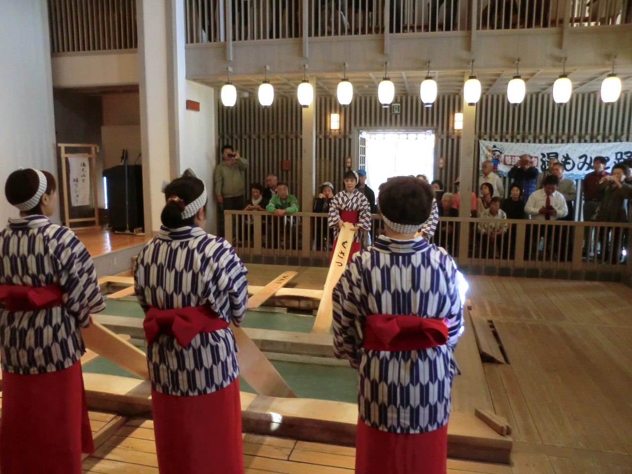 9:30からの実演に間に合うように、早めに宿をチェックアウトしました。入場料(ホテルのクーポンを利用し、550円)を支払い、1回の席を確保しました。2階にもあるのですが、湯もみ体験は人数限定(1回10人程度)です。地元の女性が、湯もみを紙ながら草津民謡を歌います。その後、観光客の出番です。希望者は靴を脱いで、湯もみ体験です。終了後は「参加賞」として小さな賞状が頂けます。ちょうど20分のショーですが、見る価値はあると思います。