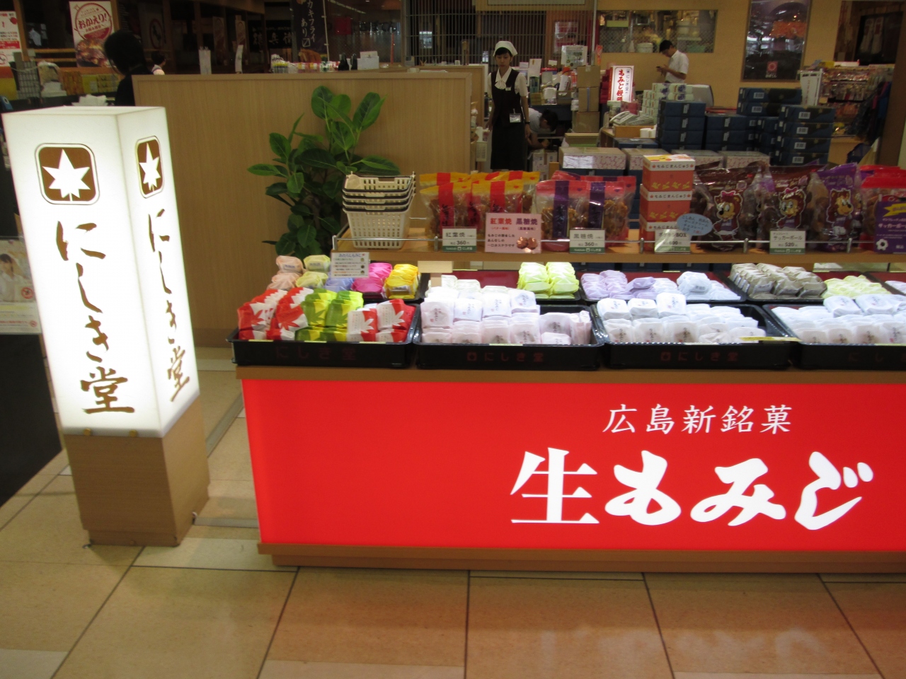 広島新幹線名店街ににしき堂が2軒もありました。ひとつは新幹線改札口付近のエントランス付近と、もう1軒は奥のスーパーマーケットがある近くでした。価格はまったく同じで、小分けができる嬉しいバラ売りコーナーもありました。同じ場所に2軒あるのはにしき堂さんのマーケットシェアが凄いということだと思います。