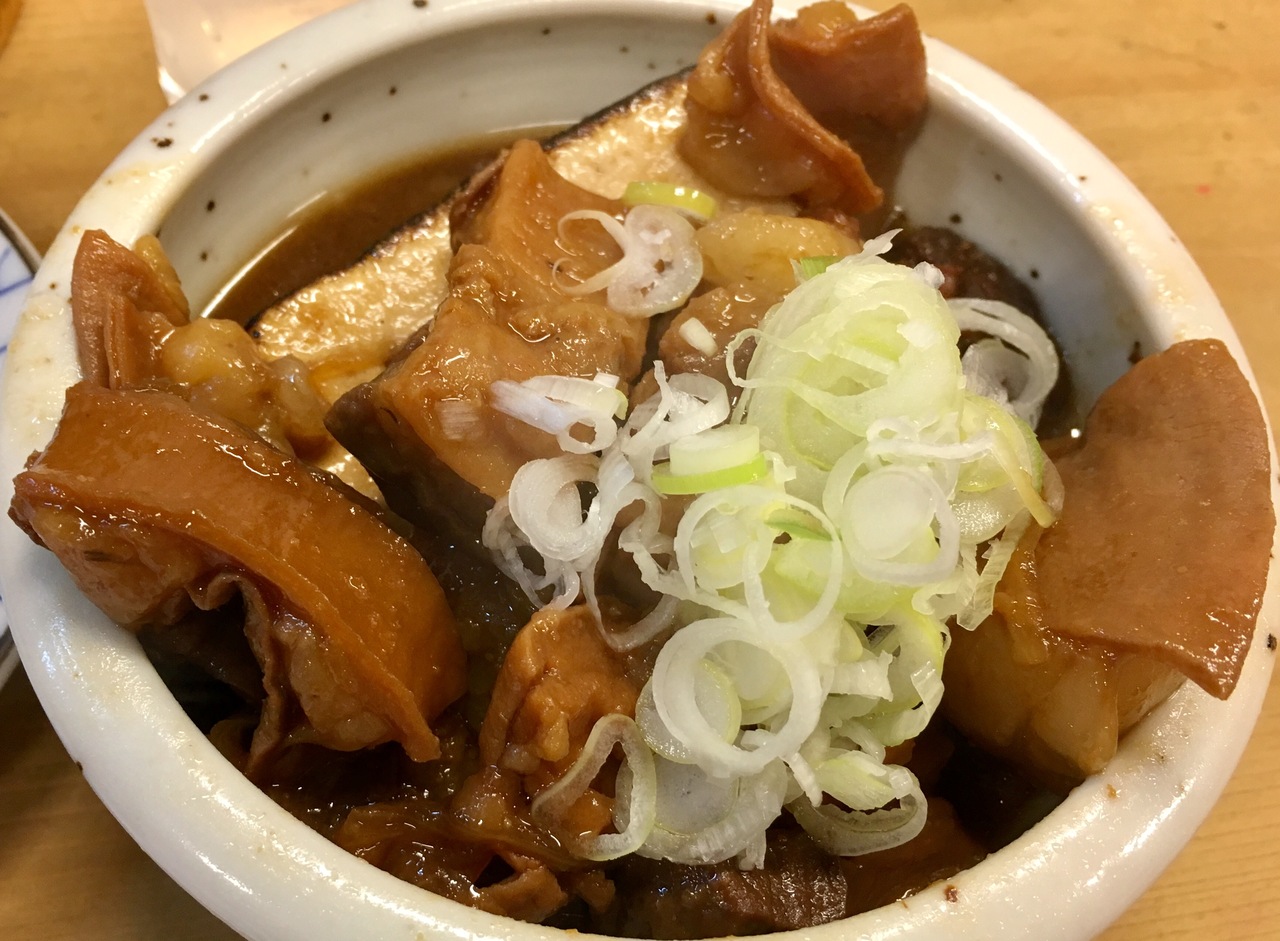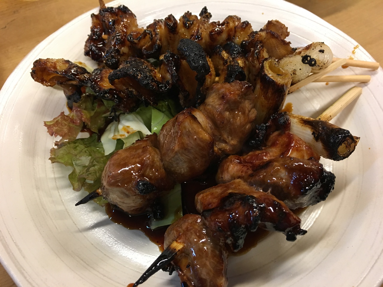煮込み、サワー、キムチとやきとんで2200円でした。やきとんは塩かタレのいずれかで注文します。シロ、レバ、ハツ、タンとかあります、2本以上からの注文です。タレで注文しました。色が黒いですが、味はさっぱりしています。煮込みも美味しかったです。