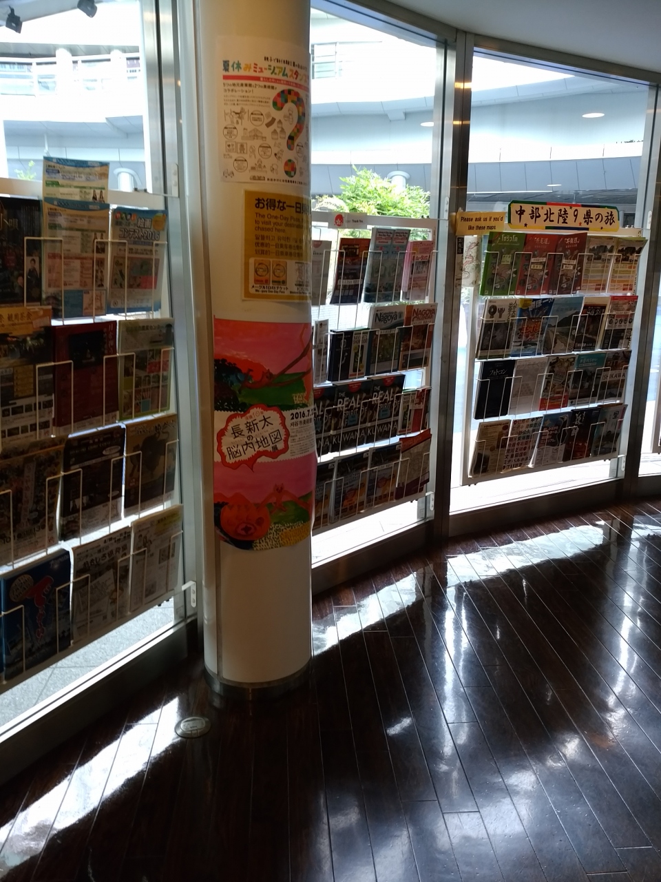 パンフレットが各種置いてあります。 又、名古屋にある博物館等の施設の情報が表になっていて、「本日は休館です。」「本日は、○時まで開いています。」等が一覧でわかるので便利でした。