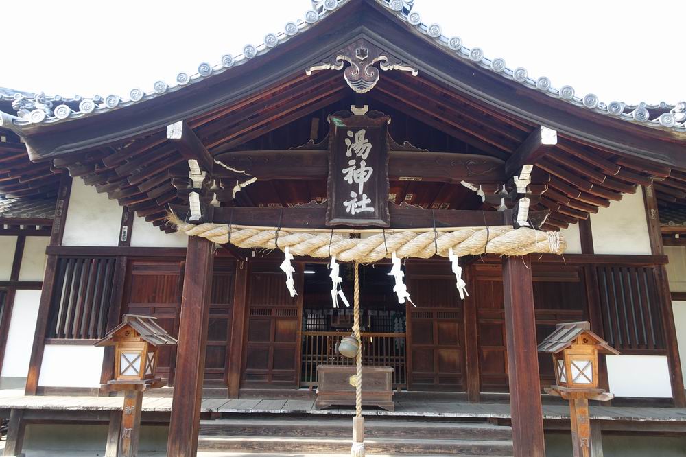 湯神社は道後温泉の守護神とされ、地震により温泉の湧出が止まった時も、この神社に祈祷をしたところ再び温泉が出るようになったそうです。道後温泉本館の南、冠山という高台上に位置しており、神社の前は有料駐車場です。