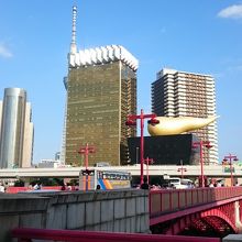 アサヒビールの個性的な社屋も一緒に撮影出来て、天気の良い日はバックが青空で綺麗な写真が撮影出来ます。