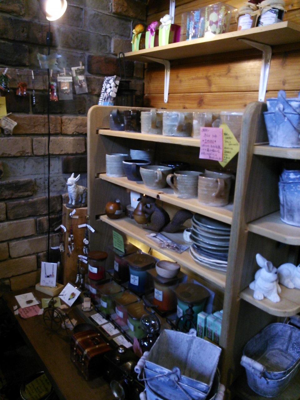 ストーブがあかあかとしていて丸太のテーブルと椅子がちょっとあるだけであとはお土産などもおいてありました。