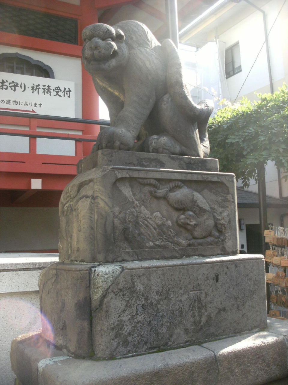 江戸時代後期のもので 安山岩でできた虎の石像は 東京大空襲の時の損傷でかなり傷んでいます。石造の高さは85センチ前後ですが 台石部分も含めた総高は2メートル余りだそうです。
