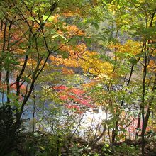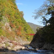 渓流の川岸に下りられる箇所もあり、荒々しい岩、しぶきをあげて流れる川、そして青空を映して更に増した深みをたたえる淵の水鏡に、紅葉がきれいに映りこむ様子を間近で眺めることができました。