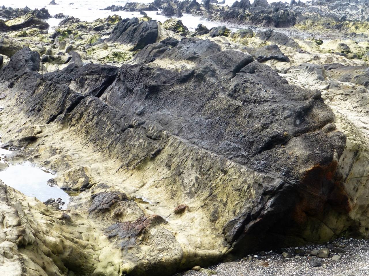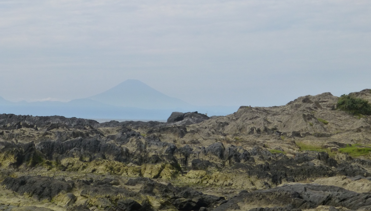 途中、漁船がある小さな[荒崎港]を通り[荒崎公園 & 駐車場]を車で着きました。海岸を散歩したら、頁岩(泥岩)と凝灰岩が層状になって海蝕台の「荒崎海岸」に! それにしても重なった層状は白岩と黒岩に圧倒されます(…台湾の野柳地質公園を思い出しました)。海岸の向こうには富士山が見えます。三浦半島には珍しい(?)砂浜の無い海岸でした。