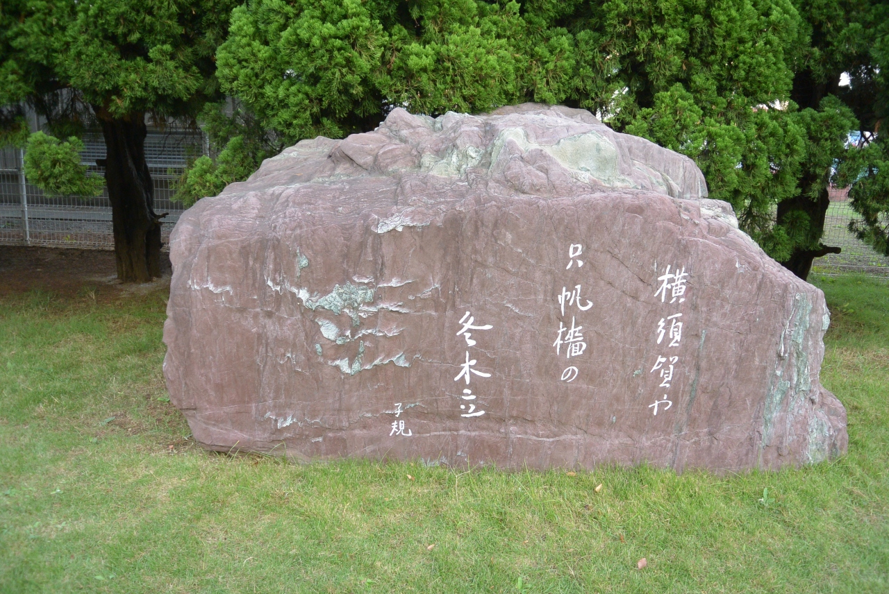 京急汐入駅から近いヴェルニー公園の南側の海軍・軍艦関係碑の一番西側に正岡子規の俳句の碑があります。平成3年建立とのことですから、このあたりを石碑群にする計画の一環ではないかとも思います。俳句は「横須賀や 只帆檣の 冬木立」というもので、船の帆が林立して冬の木立のように見える情景を詠んだものと思われます。軍国碑と並んでやや場違い感は否めません。