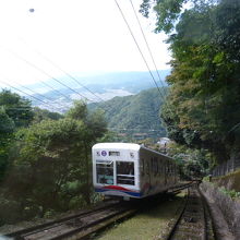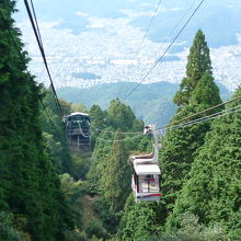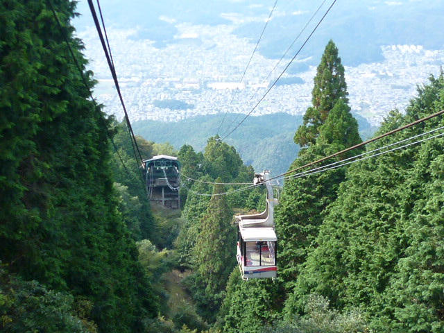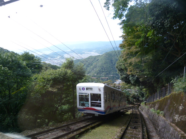 まず叡山ケーブルに乗車時間は約9分で7合目まで一気に登ります。紅葉にはまだ早く青々した紅葉のトンネルを通過します。単線ですが途中にすれ違う場所も設けてあり徐々に京都の街が小さくなってきます。