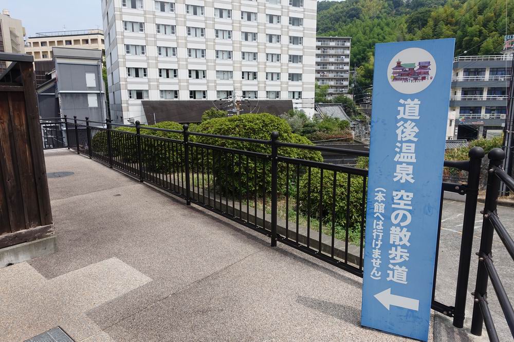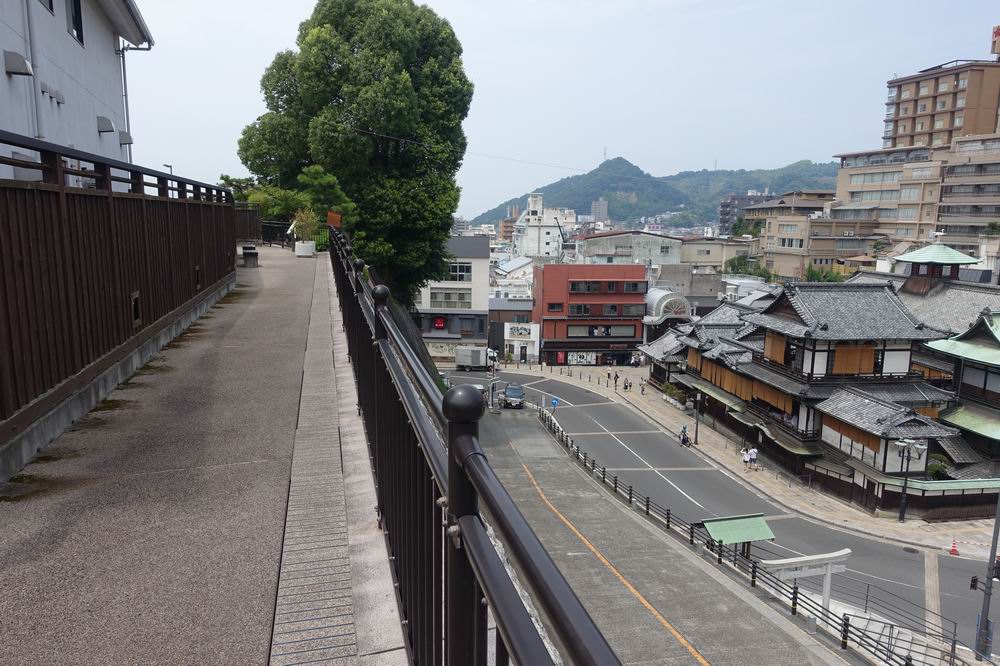 道後温泉本館の南側、湯神社や有料駐車場がある高台(冠山)にある展望スポットです。アクセス方法は、道後温泉本館側にある湯神社の石段を上り、駐車場脇にある事務所建物の裏手に回ります。案内板が出ているので分かるでしょう。「散歩道」という名前はちょっと大げさで、単なる通路に過ぎませんが、ここからは道後温泉本館を上から見ることができ眺望はなかなかです。