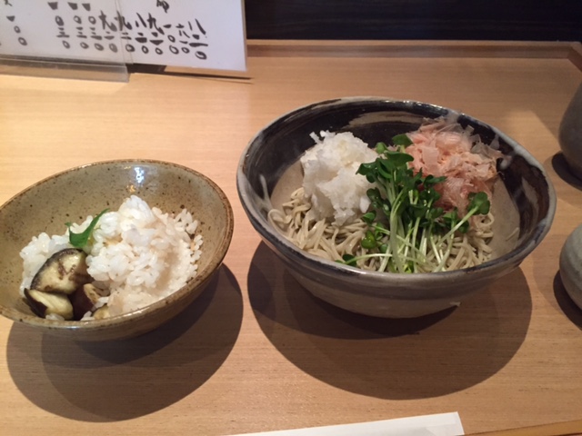 辛味大根の冷たいお蕎麦(880円)、日替わりの生姜ご飯と漬物のセット(100円)を頂きました。