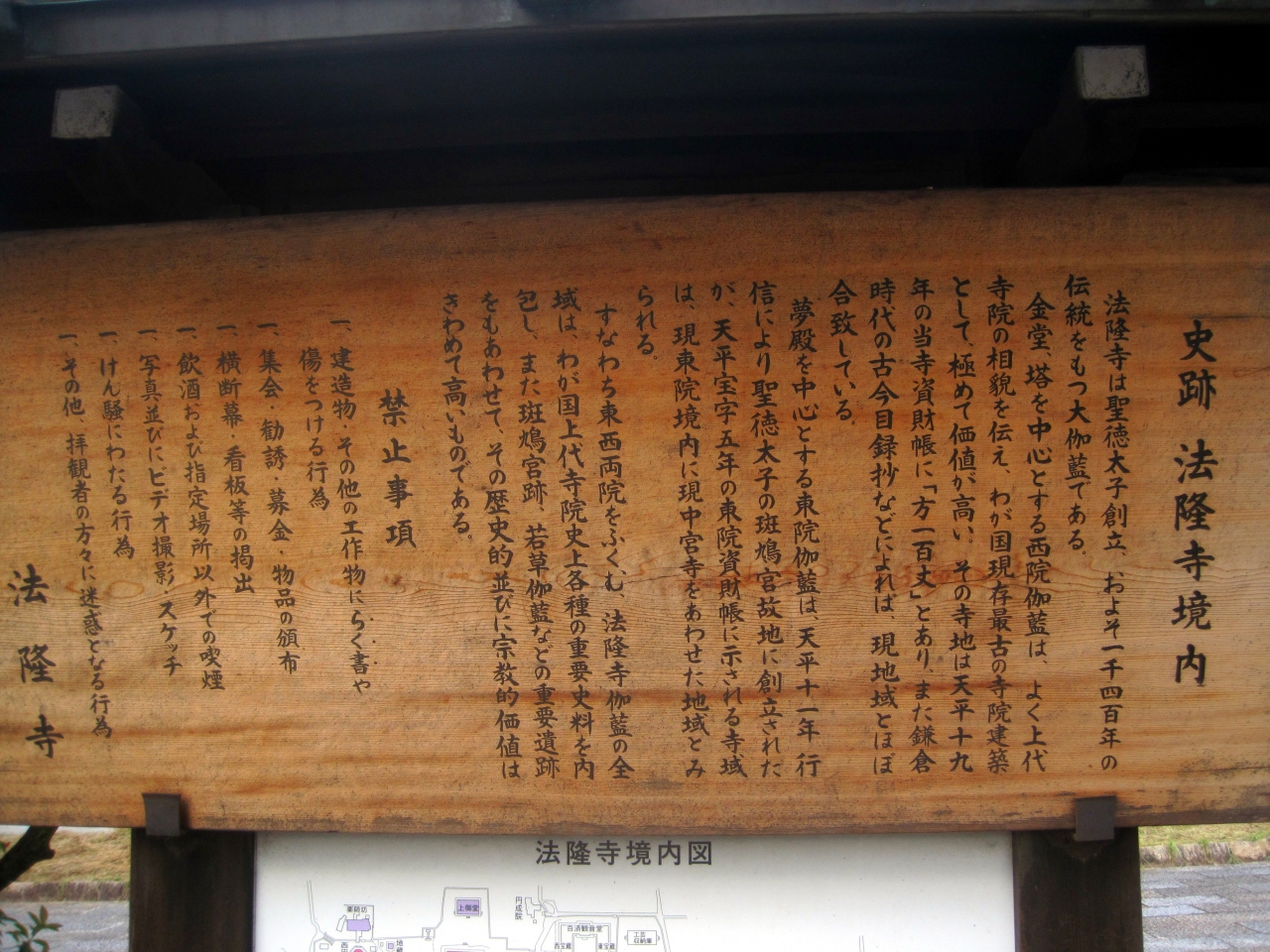 南大門に向かって右側に法隆寺の由来の説明板がある。