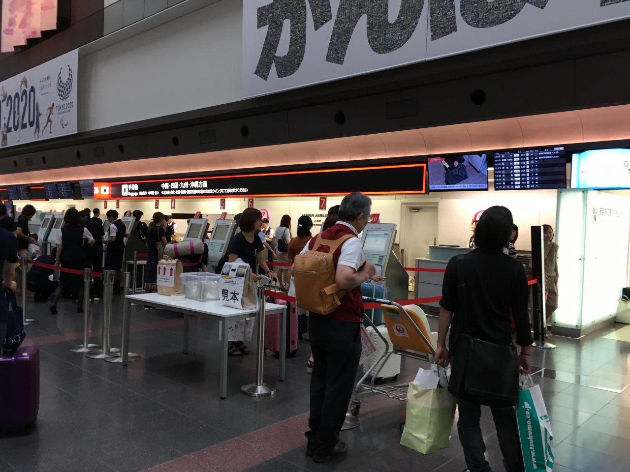 日本航空主体で使っているターミナルビル。館内は補修や改装を行っているので、昔のイメージはほぼ残っていません。テナントなどもずいぶん増えていますから、飲食店やお土産店はかなり充実しています。保安検査後の飲食店も多くあるのがうれしいですね。チェックインはたいていの場合Website上で行っているひとが多いので、荷物を預けないひとはそのままゲートにいけるのもいいですね。