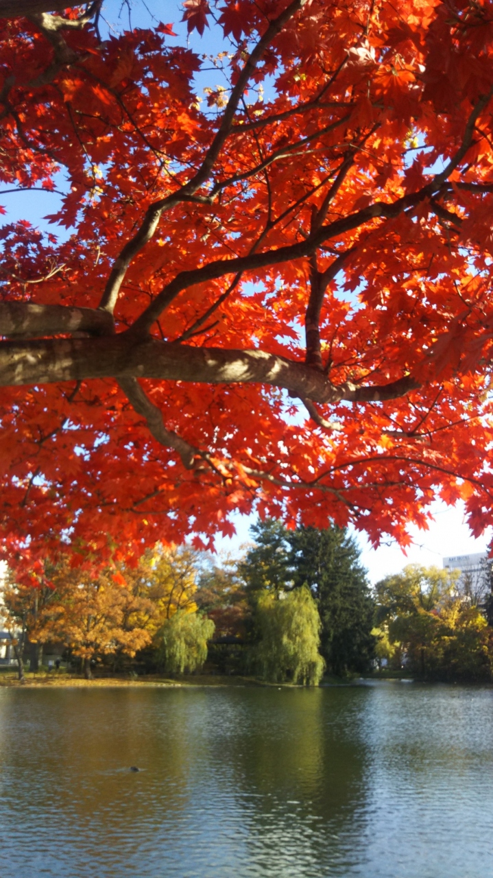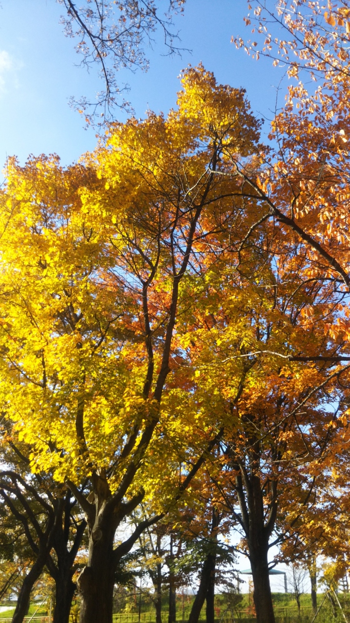 だけど、青空だし、赤や黄色に色づいた木々の葉っぱに太陽の陽があたって綺麗
