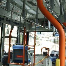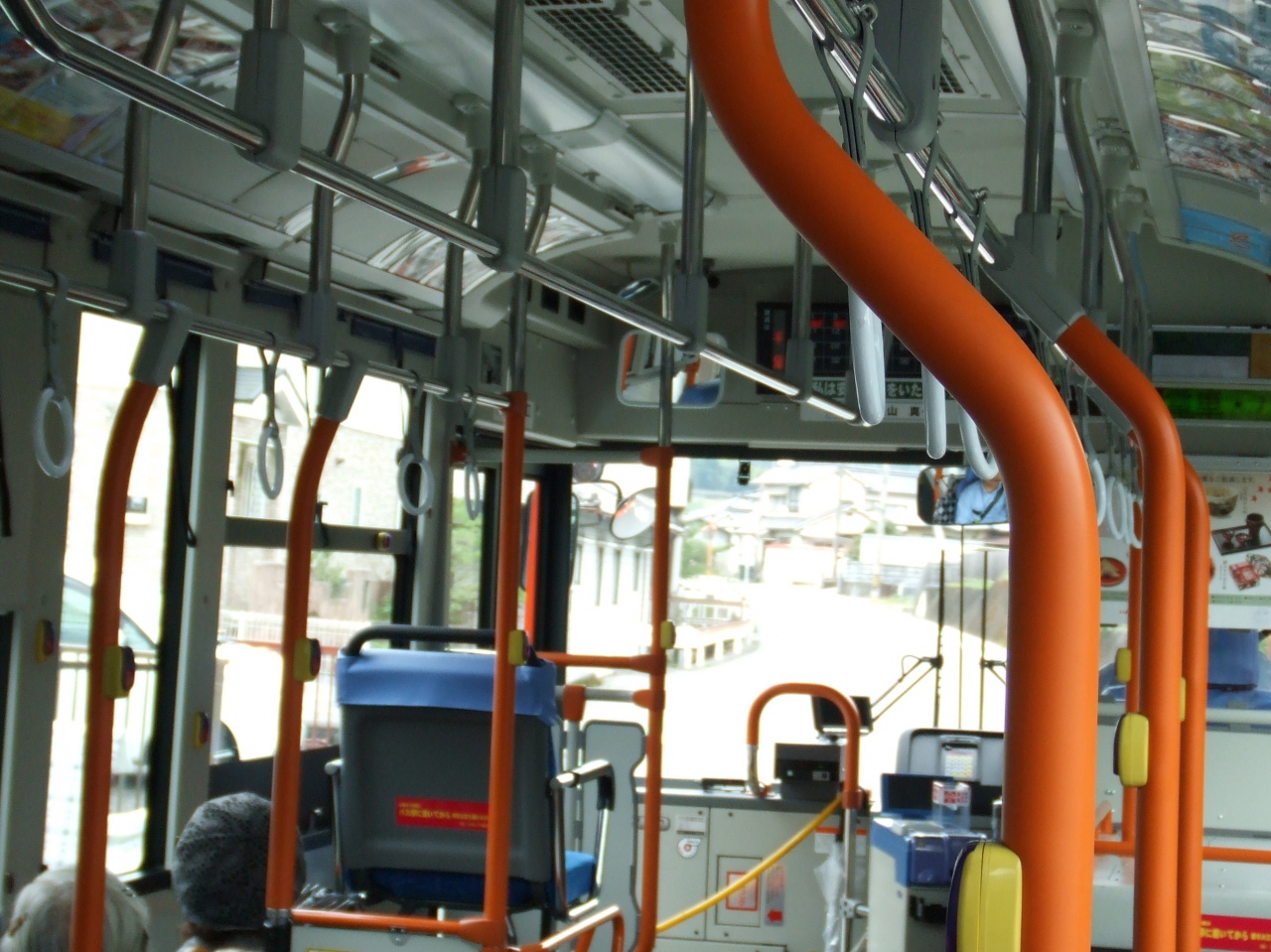 砥部まで行きたかったので「ALL IYOTETSU 2Day Pass¥2000」を購入して乗りました。バス停はホテルの近くにもあり、時間に正確で便利でした。車体だけでなく、車内もパイプがみかん色なのが印象的でした。