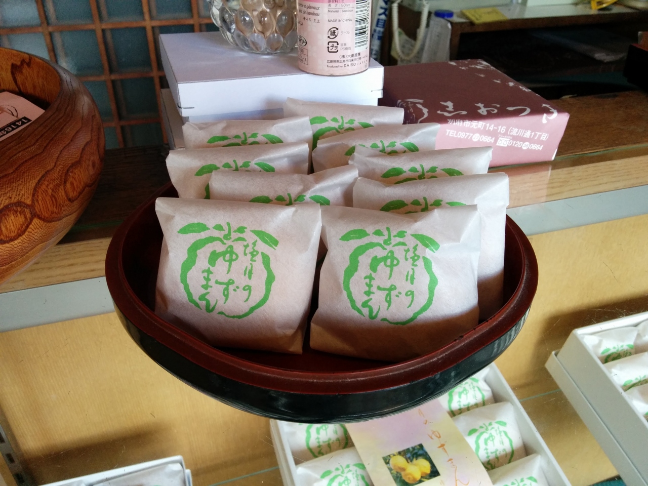 別府てんてくマップ(有料)に付いているクーポンの対象店舗になっていたので利用しました。お店に入っても人が誰もいなかったのには驚きです。外出していたようで10分近く待っていたらようやくお店の方が戻ってきました。このご時世いろいろと心配になります。クーポン1枚をゆずまん1個と交換。餡の量がとても少なく、香りも控えめで味は期待外れでした。冷たいお茶のサービスは良かったです。