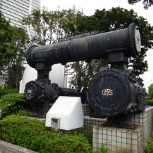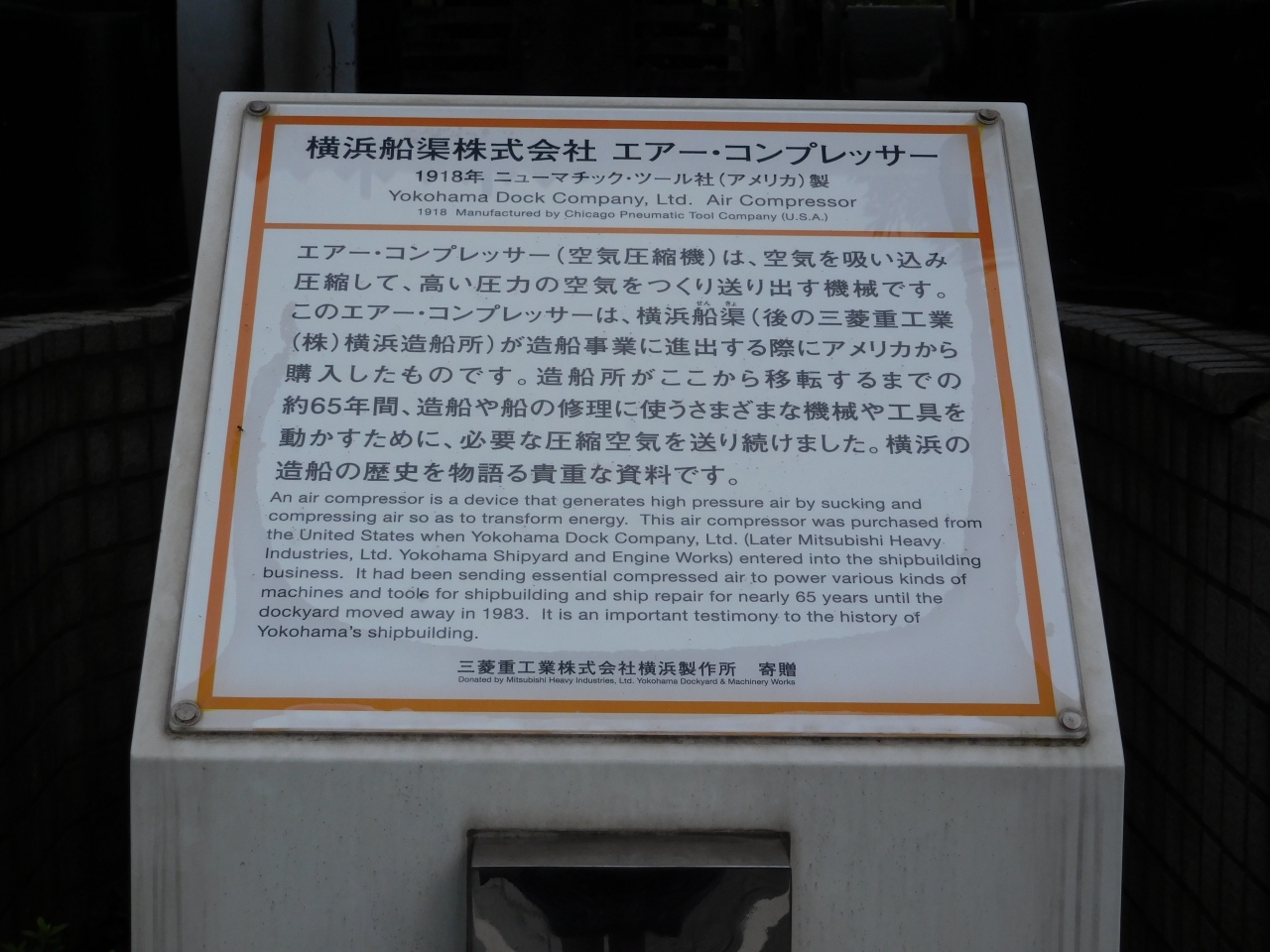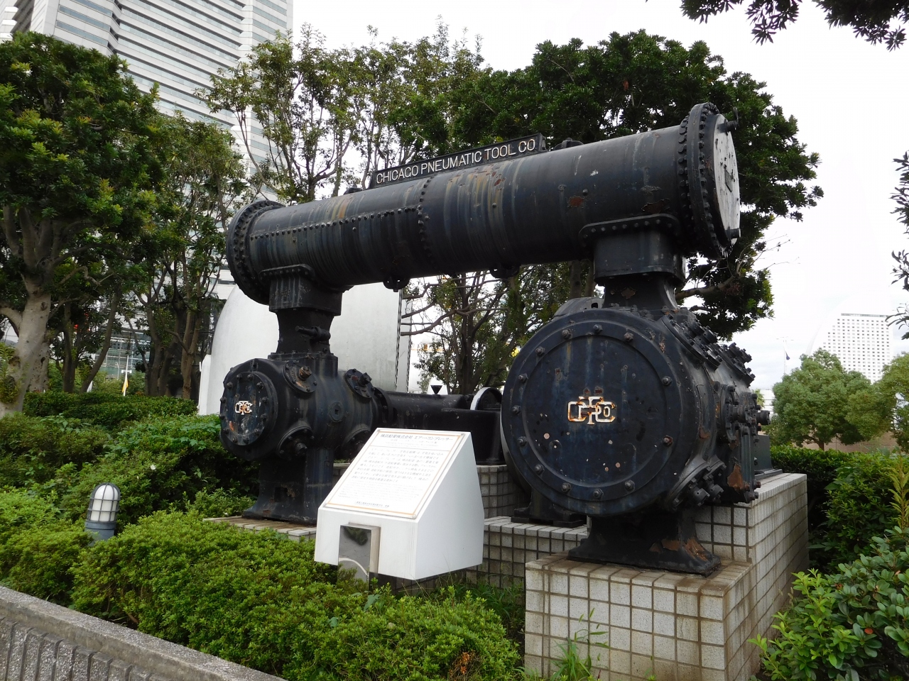 日本丸メモリアルパーク内、歩道沿いの植え込みに、ドンっと置かれていて、なかなか存在感がありました。1918年にアメリカで製造され、造船や船の修理に使う機械を動かす為に、圧縮空気を送り込んでいたものです。風雨にさらされて、かなり年季が入ってしまっていましたが、このようなものが使われていたのかと、なかなか興味深かったです。