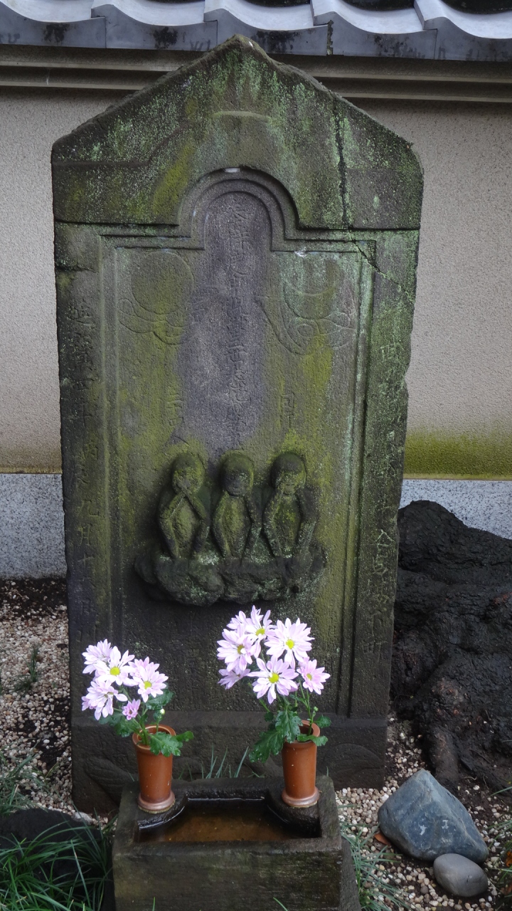 東京メトロ東西線「早稲田駅」下車、早稲田駅前交差点から夏目坂を登ると右手にあります。創建は1669年、浄土宗のお寺です。山門をくぐると、すぐ左に庚申塔があります。延宝4年(1676)に造立された板碑型の庚申塔で、中央に三猿、下部に鶏が彫りこまれており、江戸時代前半の庚申塔の特色があることで新宿区の有形文化財に指定されています。きれいな花が供えられていました。
