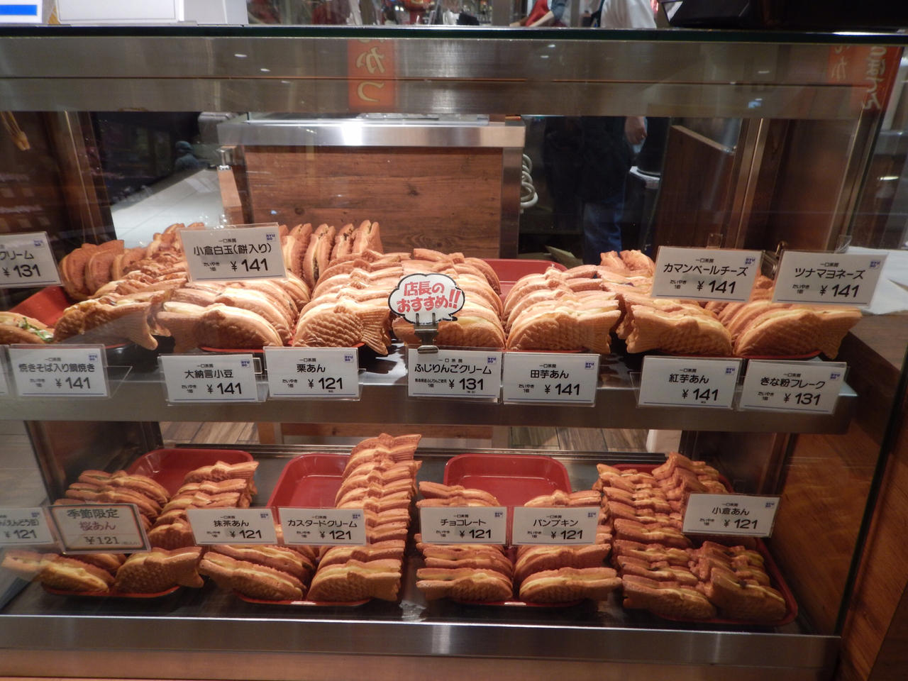 パレットくもじの地下一階にある「たい焼き」のお店です。たい焼きの種類は結構多くて、定番の小倉あん、カスタード、チョコなど以外にも、ツナマヨとか、カマンベールとか、焼きそば入りとかの食事にもなるものもありました。沖縄らしいところでは、田芋あん、紅芋あんがあり、今回は田芋あんを買ってホテルで食べました。素朴な懐かしい味で美味しかったです。
