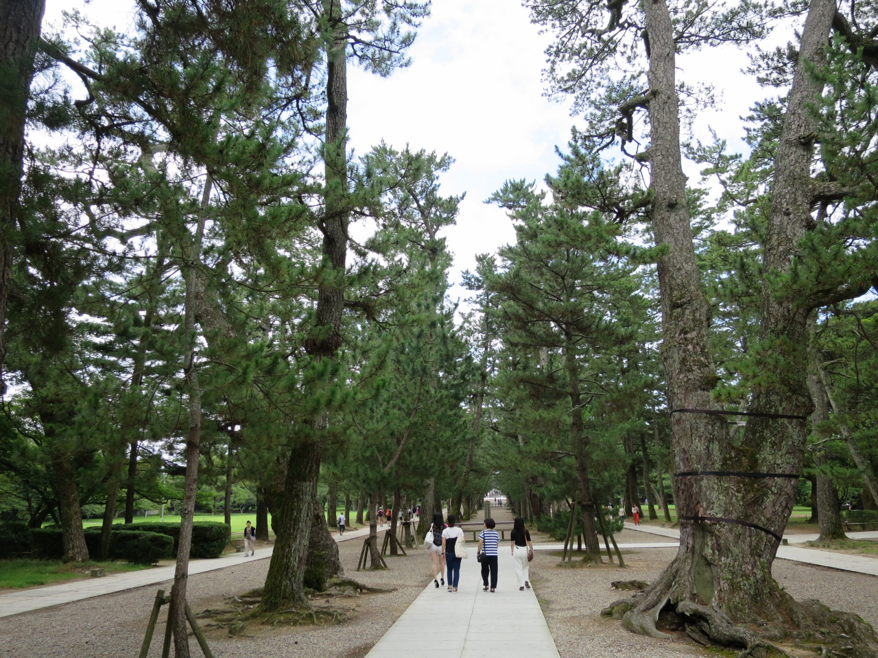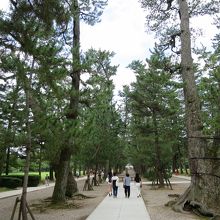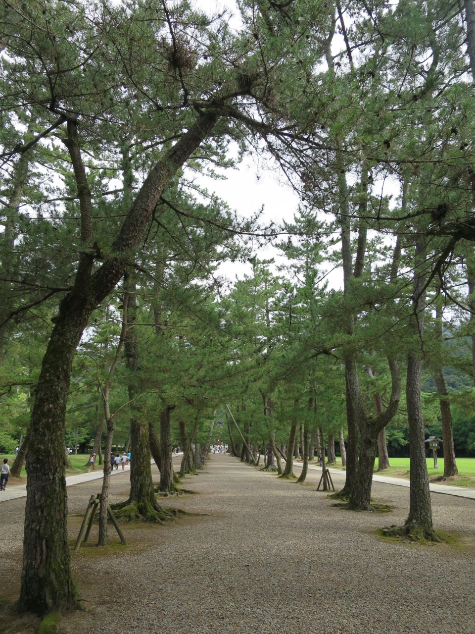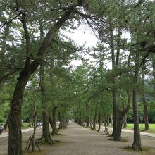 出雲大社の正面から下り参道を下り、参の鳥居を潜った先の参道は2列の松で3つの参道に区切られています。ここが松の参道(松の馬場)です。松の木hは樹齢400年を越えると言います。真ん中の参道は神様が通る道とされ通行禁止となっています。両側の参道はどちらを通行しても良いのですが、人の習性なのか、何故か自然と左側通行になっており、右側を通るとぶつかりそうになります。人の流れに従うのが無難です。