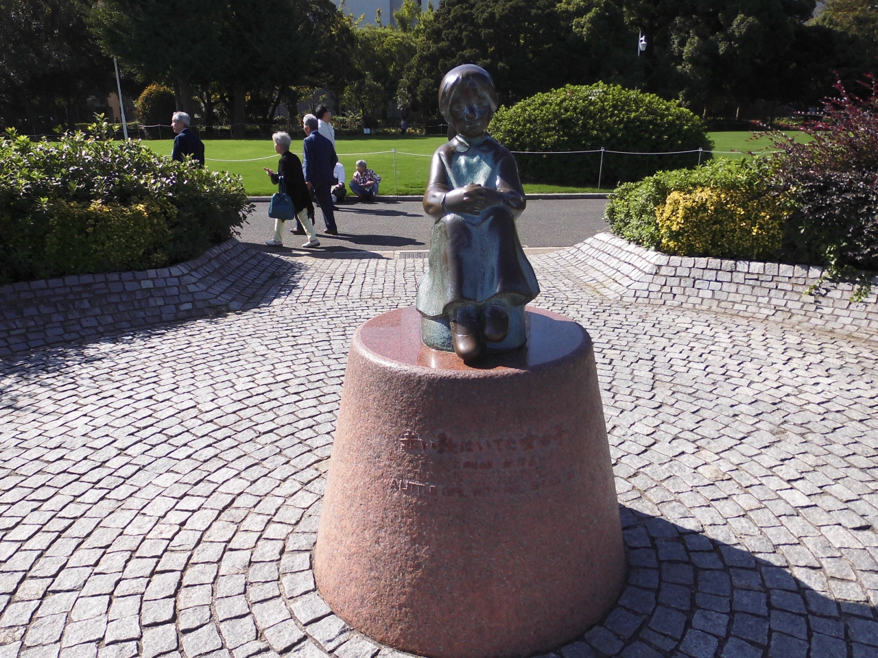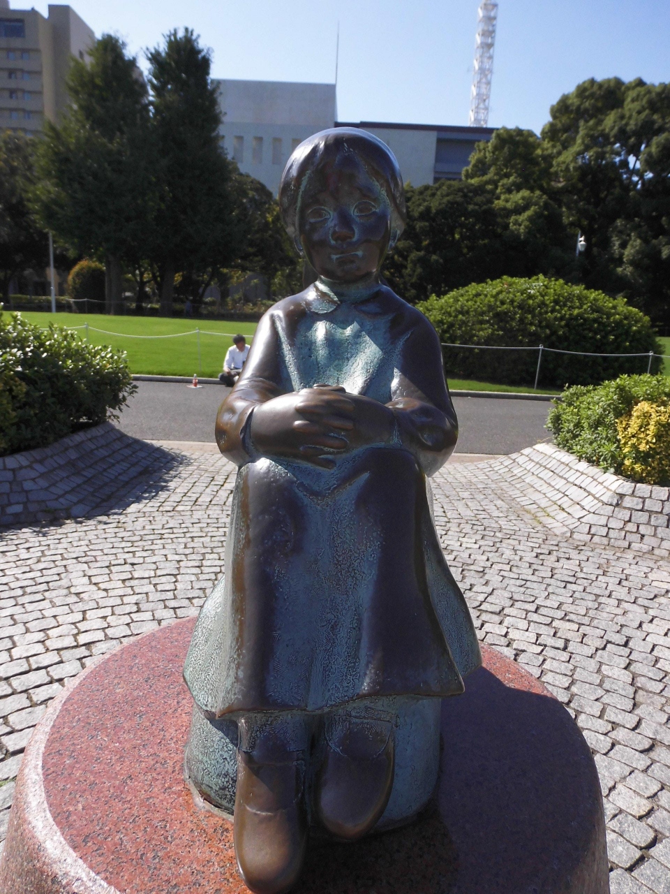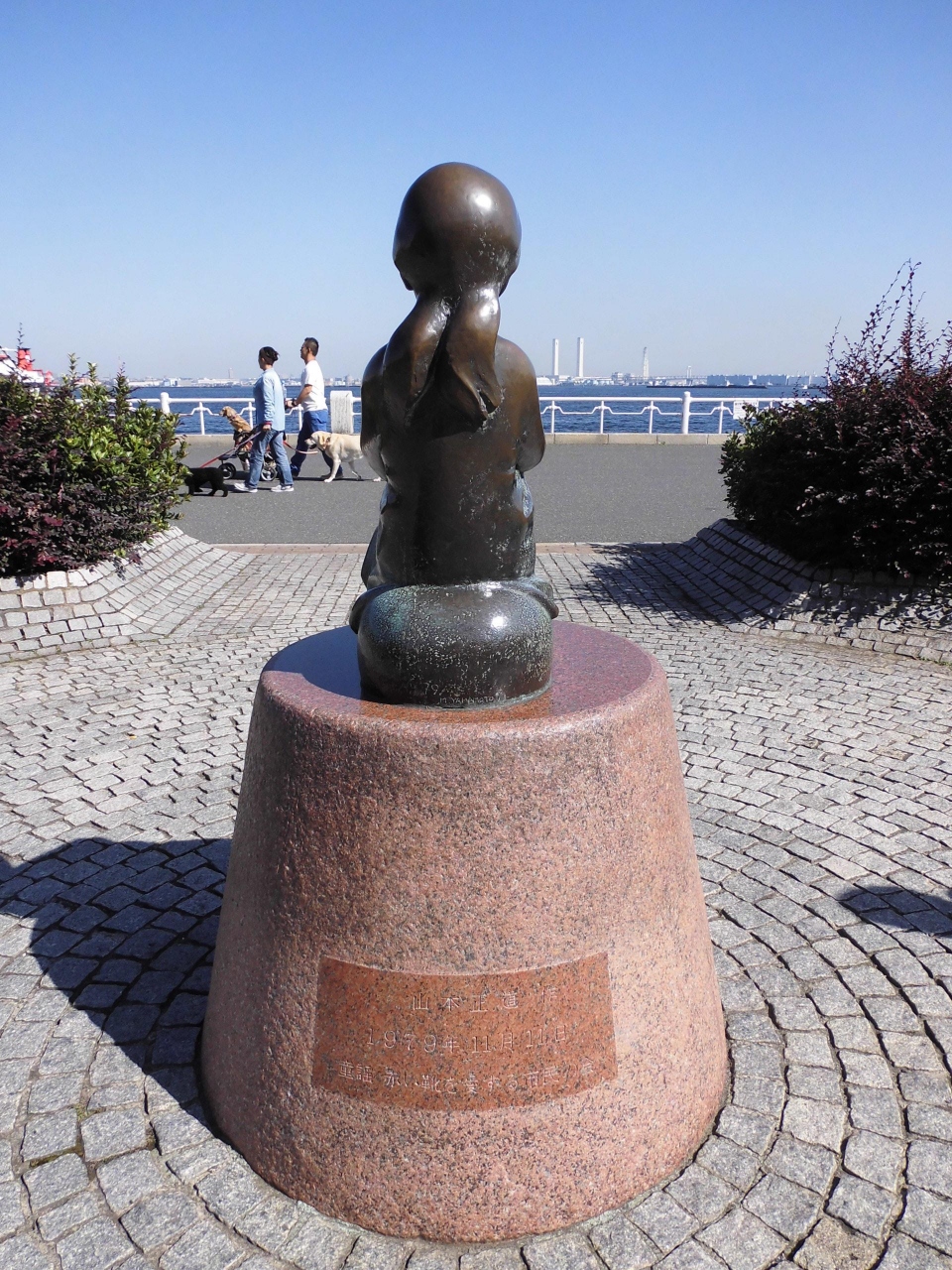 横浜港の海側に 向かって座る小さな女の子の銅像で 場所は公園の 氷川丸とインド水塔の間くらいにあります