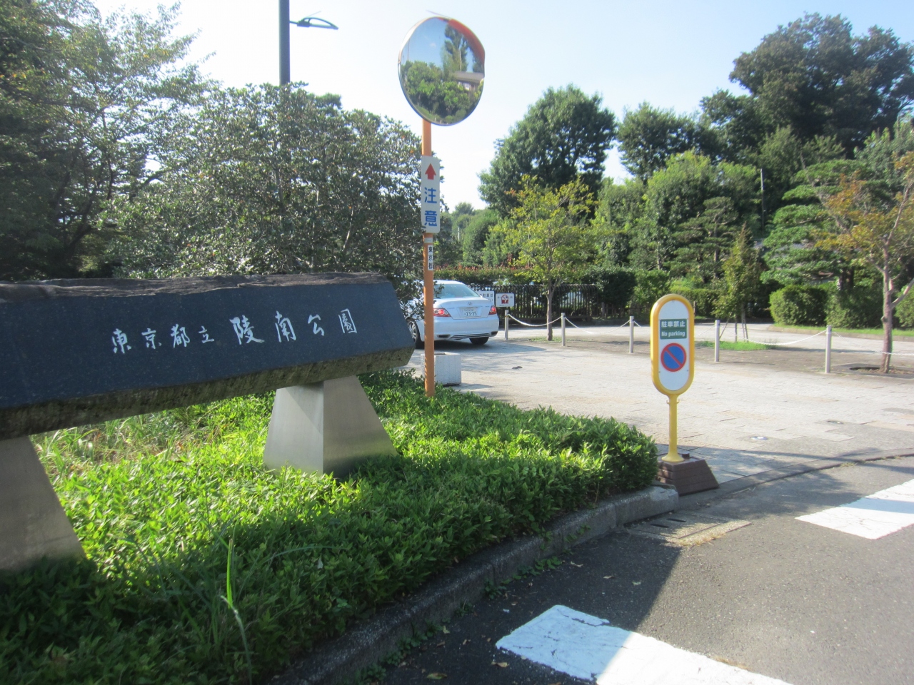 武蔵陵墓地の参道を甲州街道の方へ進んで行くと、南浅川の川沿いに陵南公園があります。武蔵陵の敷地から見ると南の方に位置しますが、多摩陵の正門からは参道を東に進んで行くことになります。緑が多く、中央に野球場があり、遊具などもあって、地元の方の憩いの公園という感じでした。