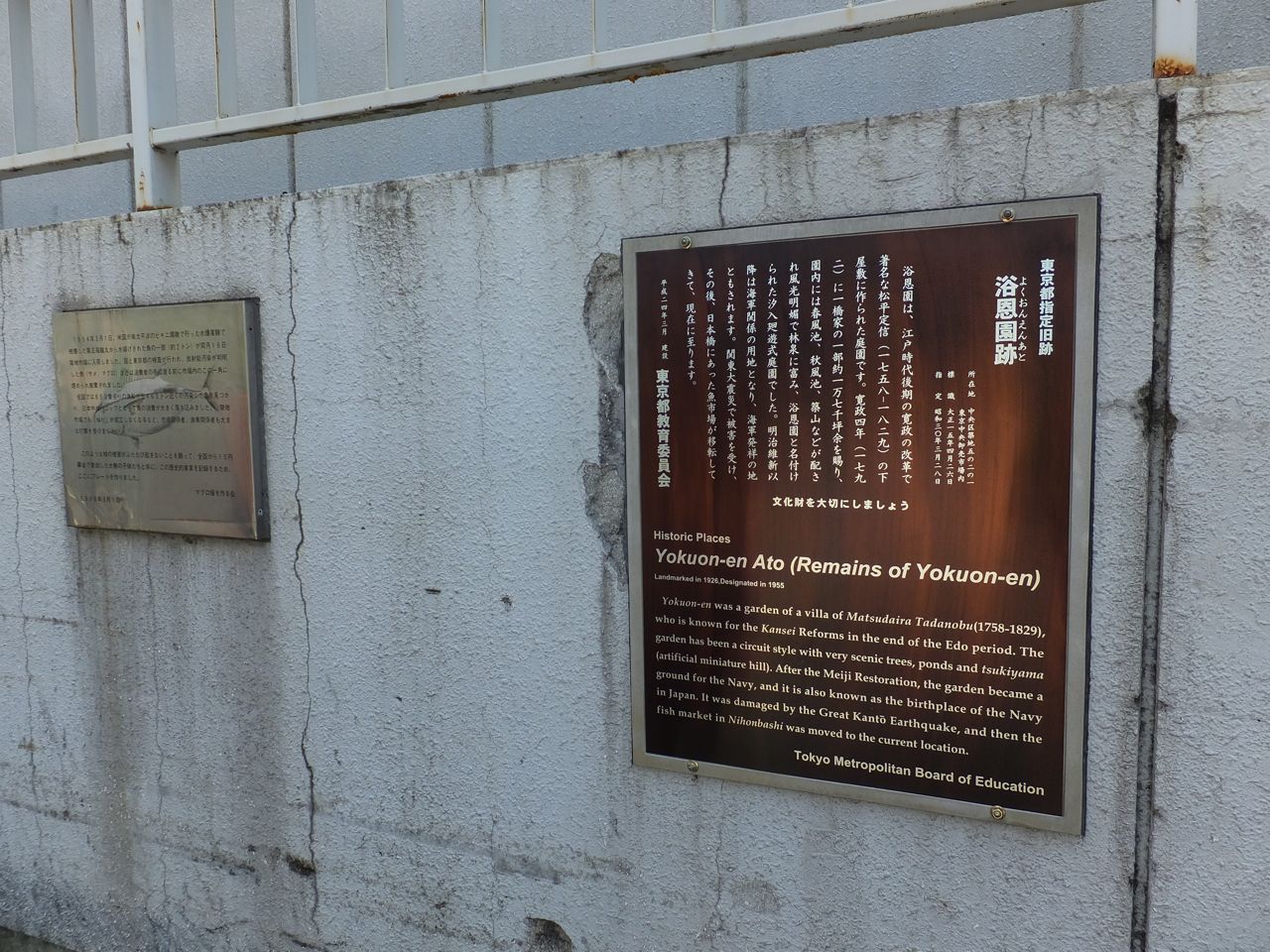 江戸時代の1800年頃にできた庭園の跡だそう。明治には海軍用地、関東大震災後は日本橋から魚市場がやってきたそう。そしてまもなく(多分)魚市場は豊洲に移るわけで、その跡は何になるにせよ、ここが江戸時代には庭園であったことの記憶は受け継いでいってもらいたいと感じました。また、プレートだけでなくどんな庭園だったかの案内も欲しいと感じました。