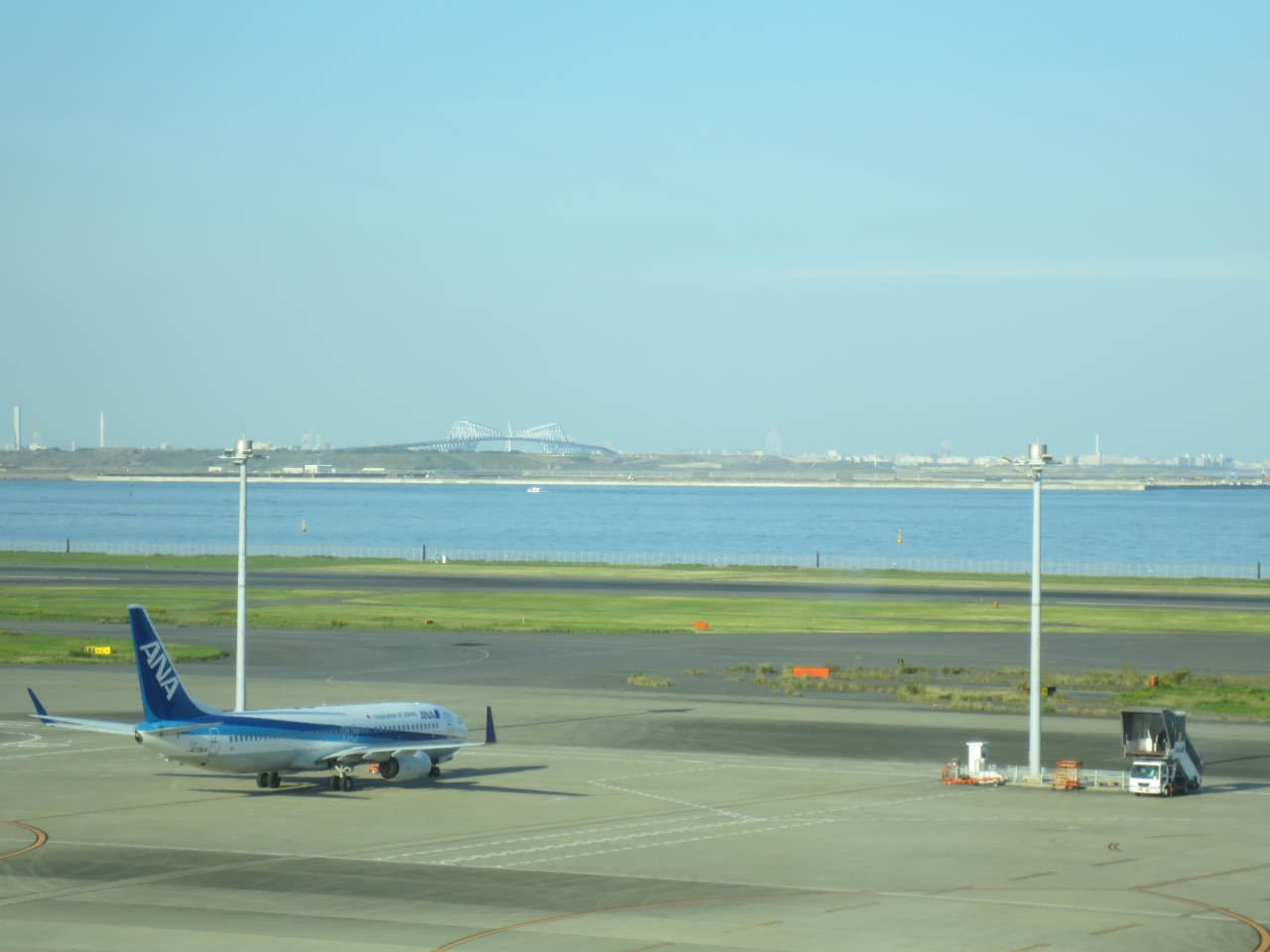 雲がほとんどない、まさに秋晴れだったので、5階の展望デッキを訪れてみました。案の定、たくさんの人が来ていて、考えることは皆同じだなと。目の前の飛行機はもちろん、スカイツリーやゲートブリッジ、それに遠く房総半島などを見渡すことが出来ます。第二ターミナルの展望デッキはエスカレーターが上がったフライトデッキトウキョウを真ん中に左右両方に備わっていて、どちらも広々としています。ANAの機体とその後方の東京ゲートブリッジをうまく写真におさめることが出来ました。