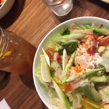 サラダがメインになるヘルシーランチを食べることができるお店。具材・ドレッシング・トッピングなどお好みでチョイスできます。フリーのお水は、女子力高めに数種類のフレーバーがあります。サラダだけでは物足りない方には、ガッツリお肉もあるのでご安心を。