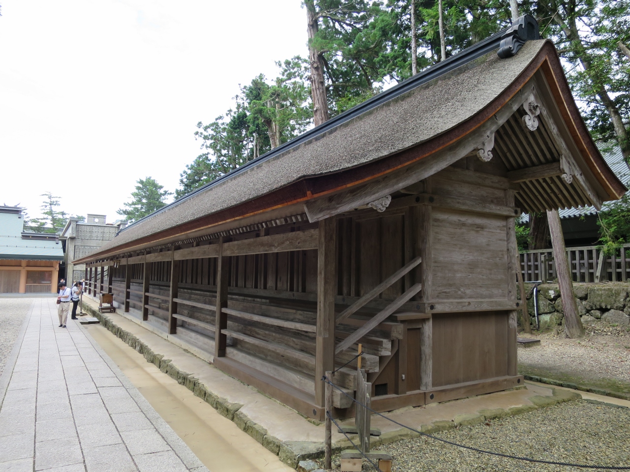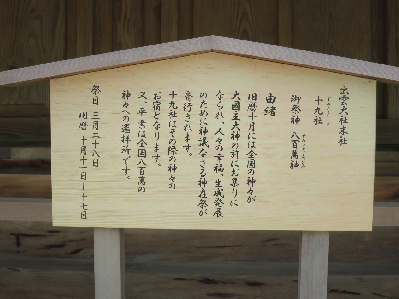 出雲大社の拝殿の東と西にそれぞれ末社 十九社本殿があります。旧暦の10月、神在月に全国の八百万の神々がここに宿泊する所で、普段は十九ある扉は閉じられていますが、神在月には開かれます。
