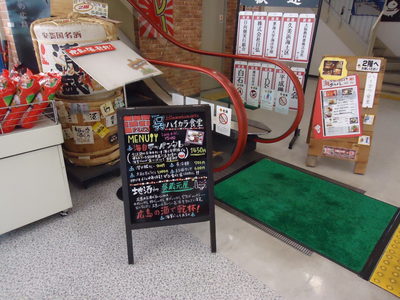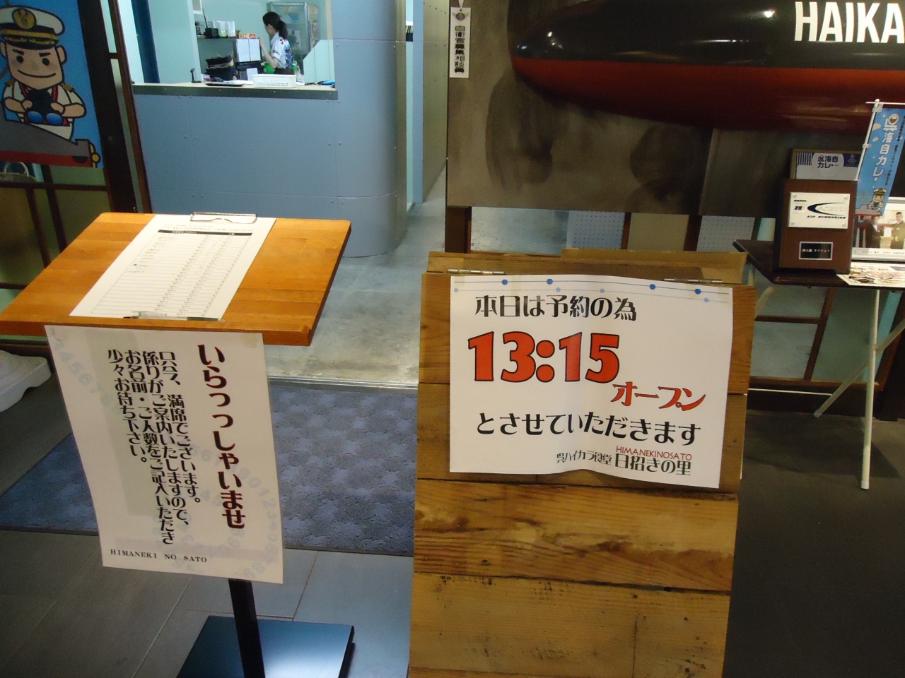 観光案内所で一番近くで海自カレーを食べれるところを聞いて行きました。駐車場のビルの2Fです。1Fからエスカレータの前でメニューの看板があり営業中と思い2Fに上がりましたが、団体の為13:15からの営業とありがっかり。1Fのメニューの看板に張り紙してくれればいいのに。不親切だと思いました。