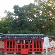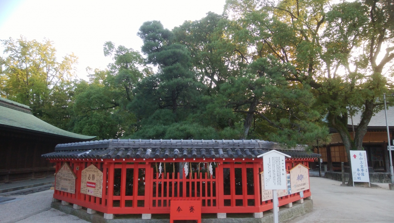 一の鳥居をくぐり本殿に向かってまっすぐと進むと拝殿手前の右側にこちらの松があります。瓦屋根が葺か朱色に塗られた木柵があって、さすが箱崎宮の御神木の柵という感じで、別格な雰囲気になっています。手入れされた立派な枝ぶりの松で風格があります。そして何よりも注目が木柵に掲げられた、地元プロスポーツチームが奉納した巨大絵馬で、ソフトバンクホークスやアビスパなどのチームのロゴと選手の直筆と思われるサインがしてあって、見ていて楽しめます。