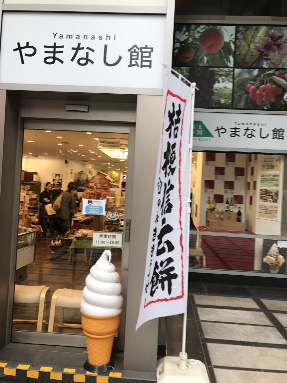 山梨県のアンテナショップです。山梨と言うとやはり信玄餅が有名どころです。信玄餅をふんだんに使った信玄ソフトは黒蜜がたっぷりの信玄餅がソフトクリームに乗っています。中でもワインがテイスティングでき、一杯300からとかなりリーズナブルです。