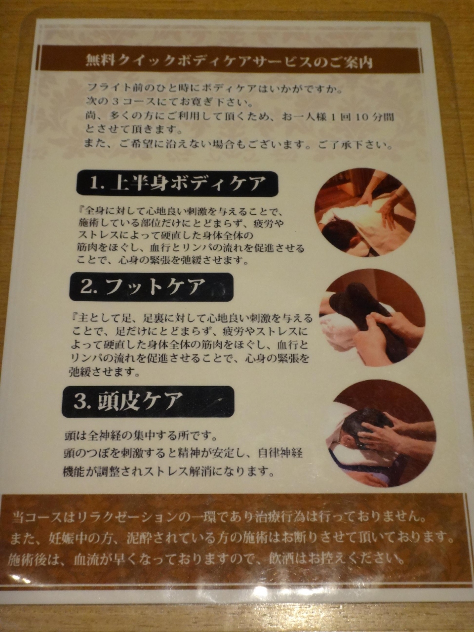 - 無料クイックボディケアマッサージ(上半身ボディケア、フットケア、頭皮ケア)を受けることができる。