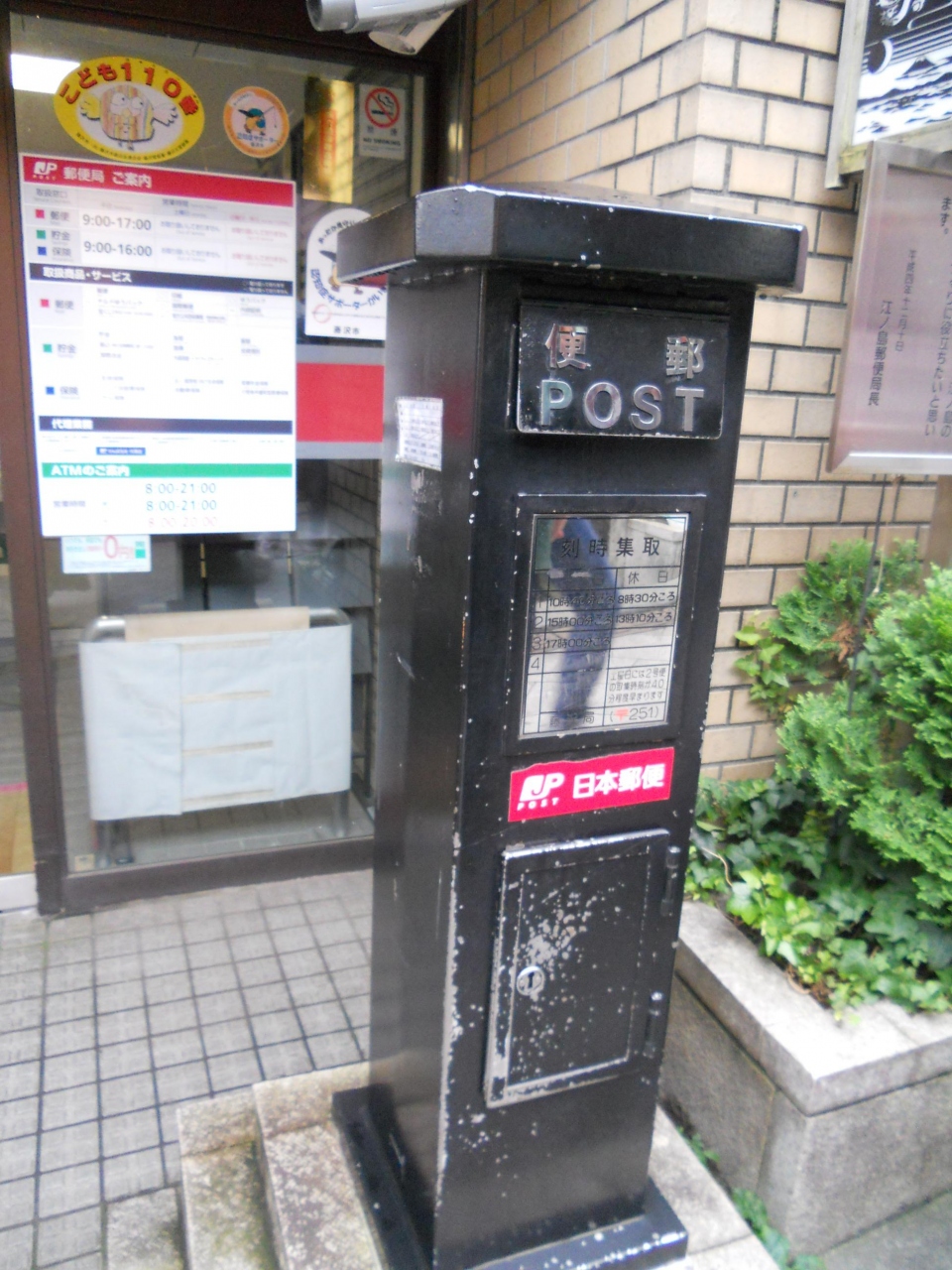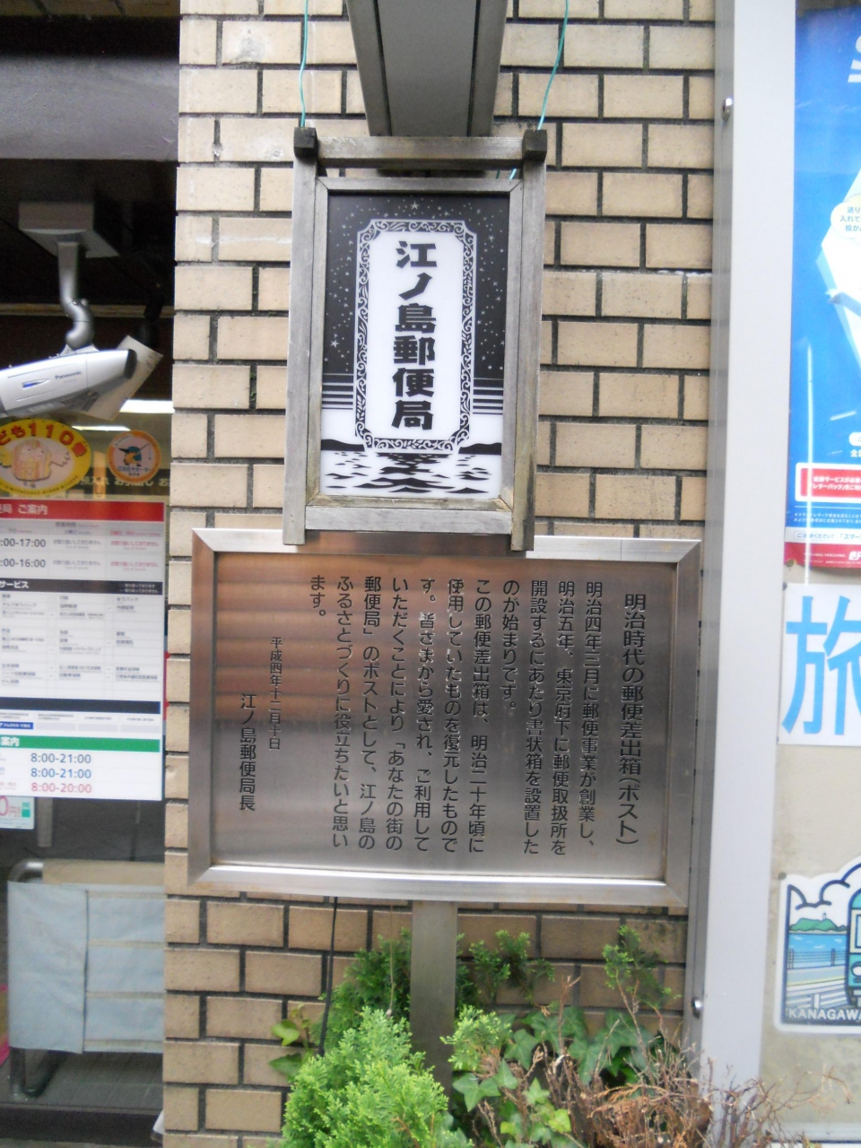 「江の島弁天橋」から「江島神社参道(江の島弁材天仲見世通り)」を進むと左手に簡易郵便局があり、その入口右側に黒い角型のポストが建っています。明治20年頃に使用したものを復元したもので、現在も使用されているようです。