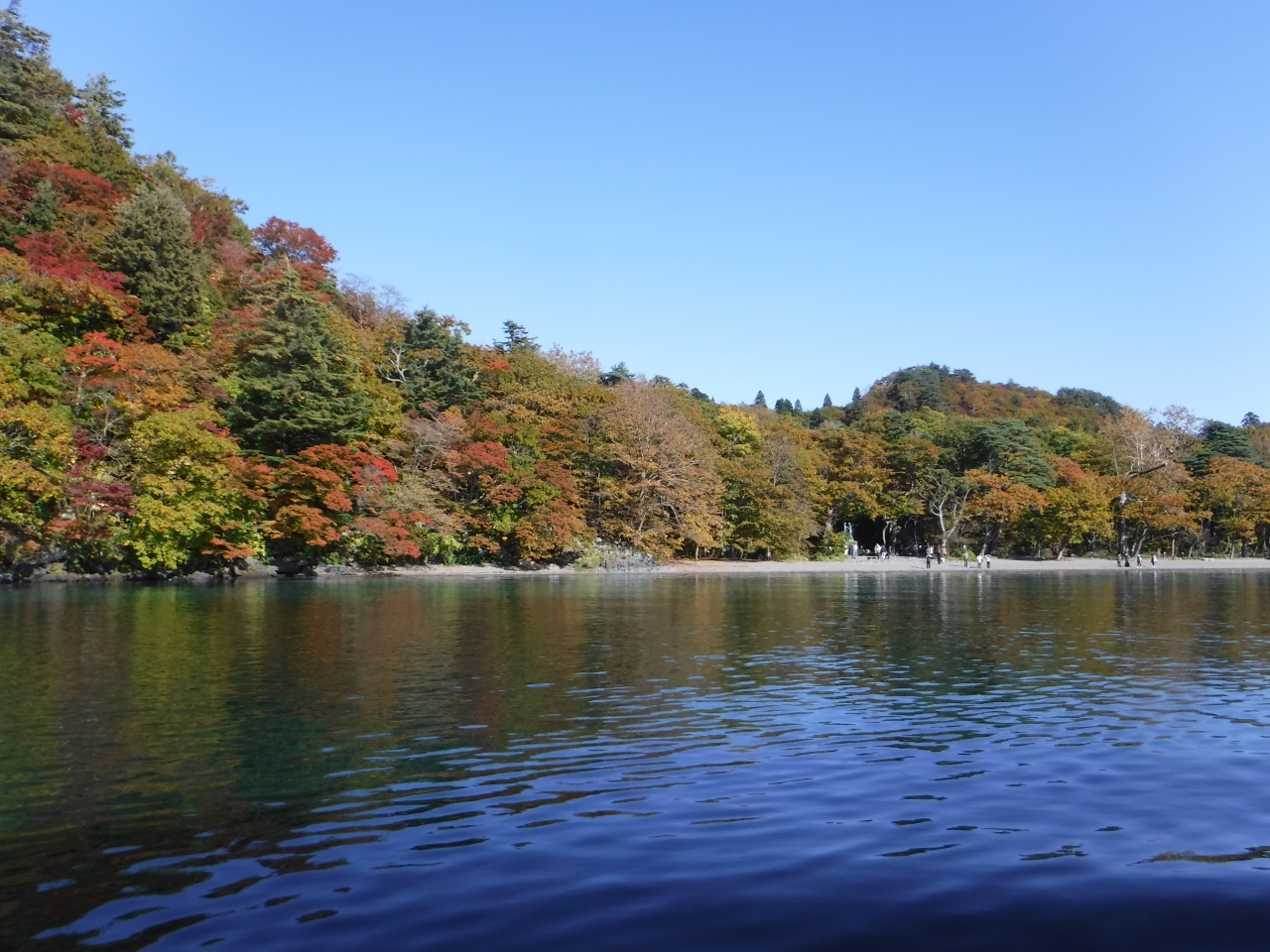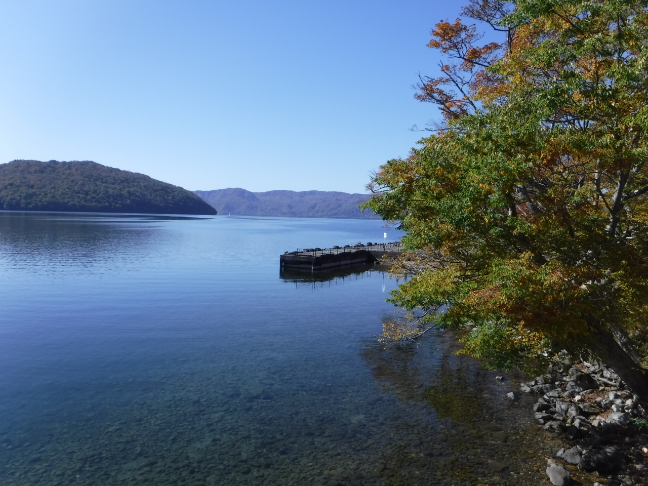 奥入瀬渓流沿いを十和田湖方面行きのバスに乗って行くと、子ノ口で急に視界が開け真っ青な湖が目に飛び込んできました。この日は雲一つない青空、紅葉も見頃を迎え