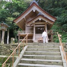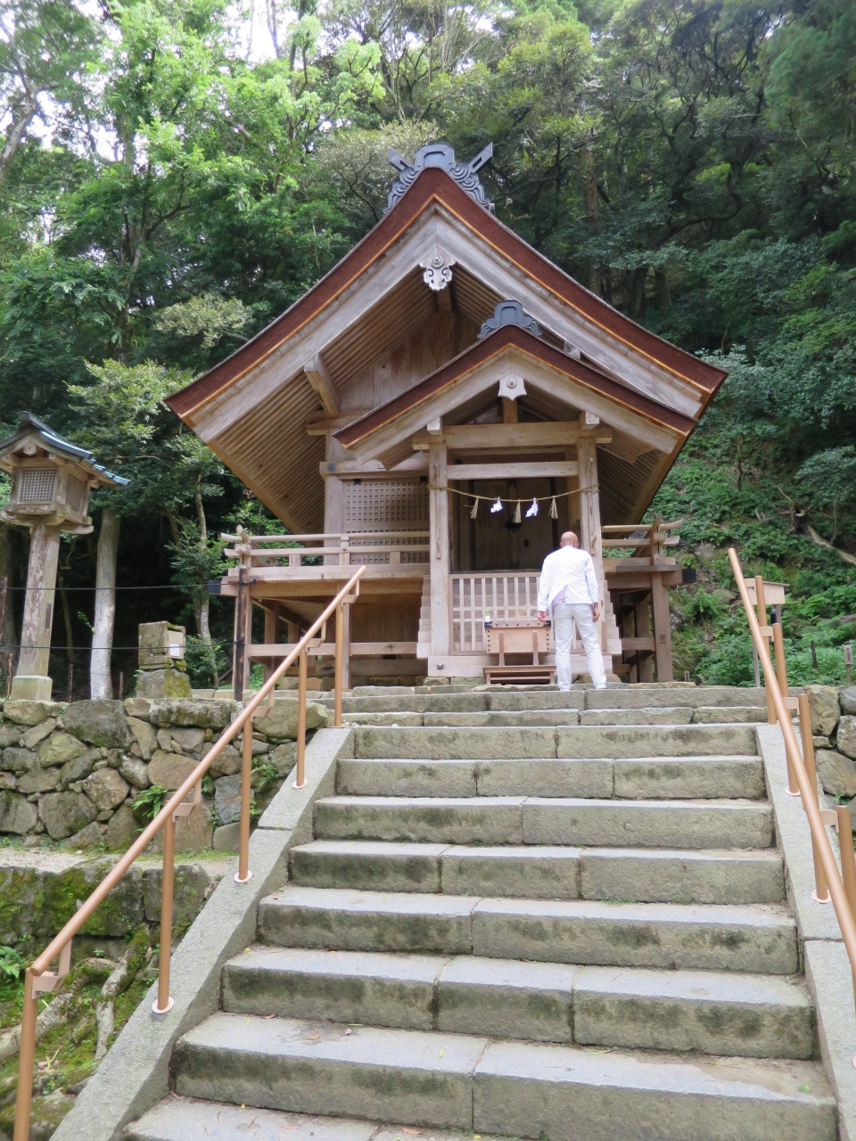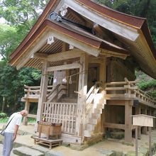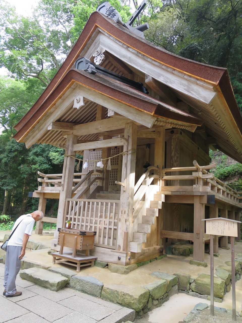 出雲大社の最奥、本殿の真後ろに素鵞社はあります。八岐大蛇を退治したスサノオを祀る摂社で、裏山(八雲山)の木々を前にして本殿を守る様に一段高い所に鎮座されており、落ち着いた雰囲気です。素鵞社の後ろに巨大な岩がありパワースポットとして人気があり、触れるために裏に回る人が多くいます。