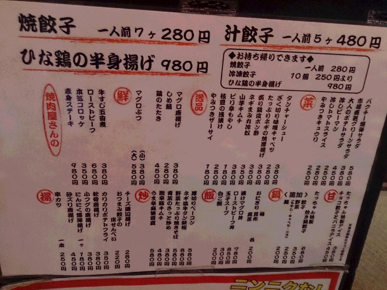 小倉駅歩いて5分、飲食店でにぎわう一角にある餃子居酒屋です。軽く餃子でもと思って入ったのすが、とにかく安い。しかもボリューム満点。そしてうまい。焼餃子に鶏の半身揚げ、牛肉の赤身ステーキとスタミナがつきそうなものばかり注文。ポテトサラダにざく切り味噌キャベツも頼んだため、もうこここでお腹がいっぱいになりました。あなどってはいけないお店です。大変満足したお店です。雰囲気もスタッフも最高です。おすすめの店です。