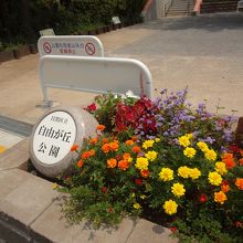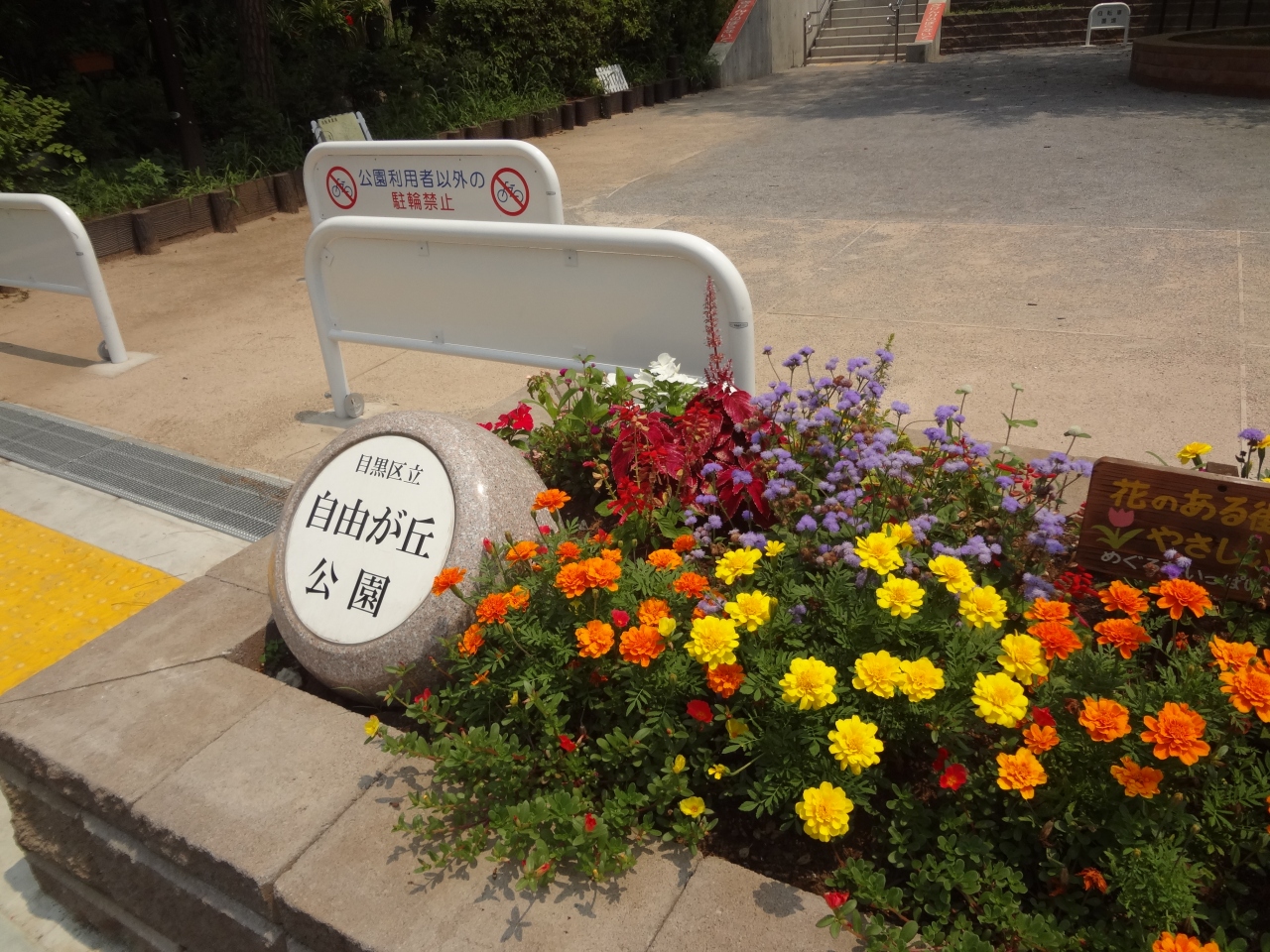 「自由が丘公園」は、自由が丘駅を降りて北に進み、目黒通りに向かう途中にある区立の公園です。特に歴史的なものはなく、観光要素は少ないですが、入口脇に設けられた花壇に植えられた、色とりどりの美しい花が印象に残りました。