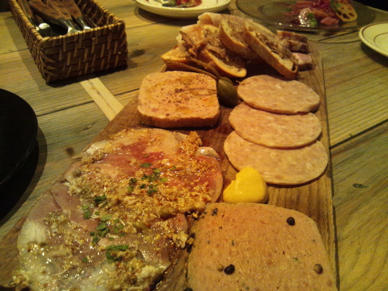 シャルキュトリー盛り合わせ(1880円)は、ハム、パテなどが数種類盛り合わせてあり、ビールのおつまみに最適なばかりでなく、見た目が豪華でうれしくなる料理です。