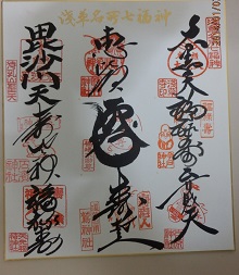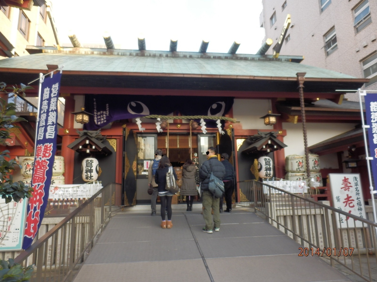 吉原神社から徒歩約5分で鷲神社に到着。おとりさまとよばれる、酉の市で有名な神社です。寿老神は本殿内左手に安置されていますがが、足しか拝めません。出し惜しみ?本日石浜神社に次いで2つ目の寿老神です。寿老神は中国出身で、不老長寿の神様です。御朱印を頂きました。中央に「なでおかめ」が置いてあり、顔をなでるとご利益があるといわれています。以外と人は多くなく、ゆっくりと拝むことができました。敷地内には正岡子規、榎本基角、樋口一葉の句碑、歌碑が立っていました