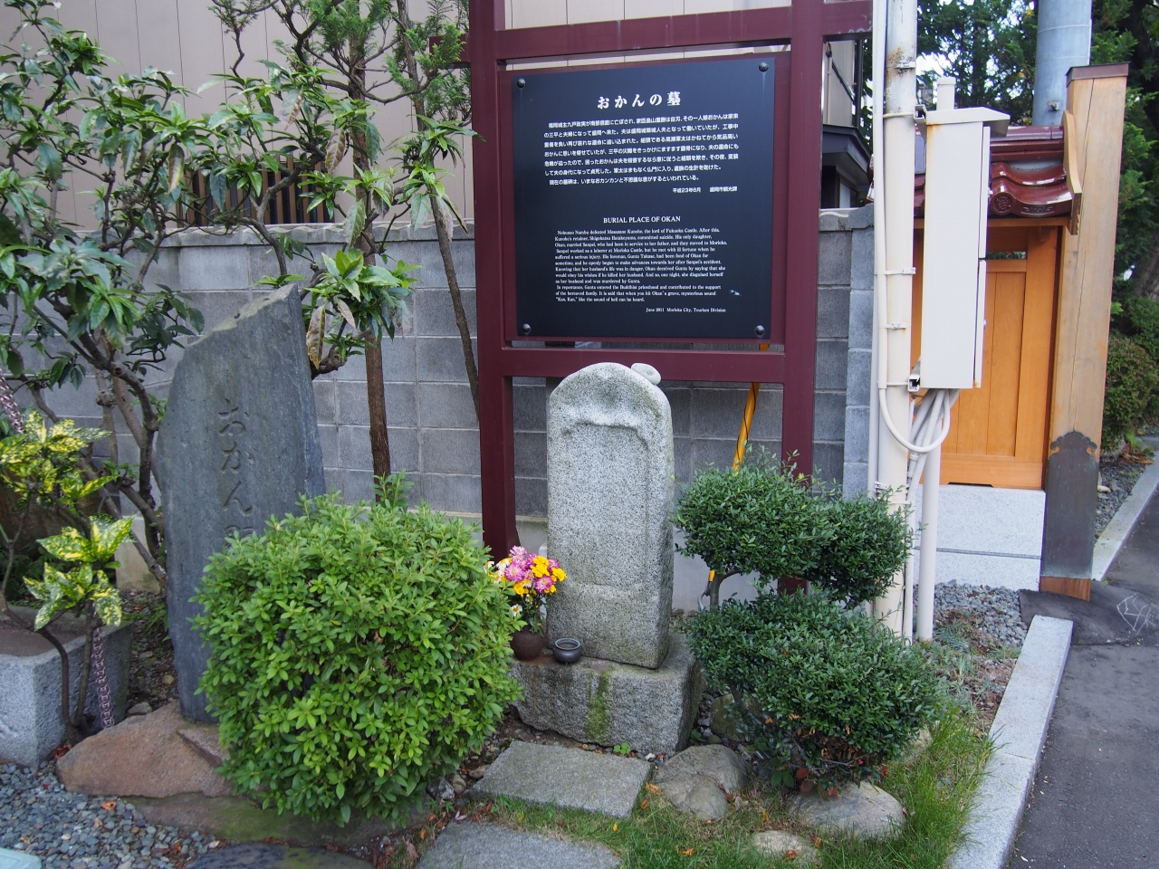 貞女おかんの墓は北山寺院群のひとつである大泉寺の境内にあります。鳥居をくぐり、すぐ左側に案内板とともにおかんの墓があります。墓を叩く金属音がするということですが、墓の上には叩くための石が置かれていました。それを使うと確かに金属音がしました。