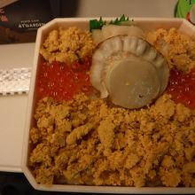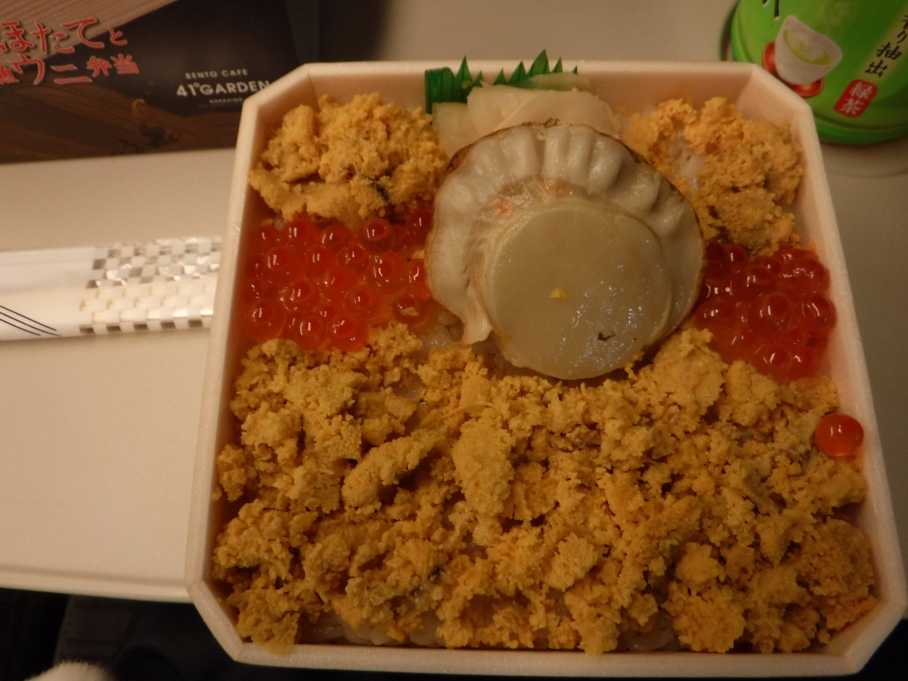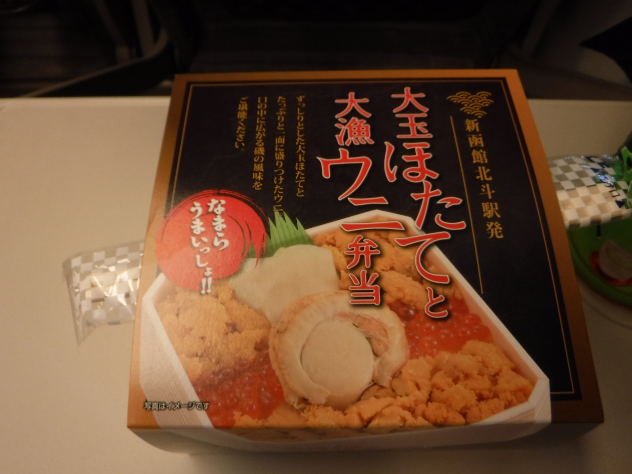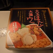 旅行の〆に新幹線の中で駅弁を食べたいので、事前にネットで調べて八戸駅で買うことにしました。車内でも買えるのかもしれませんが、乗車時間が1時間20分しかないので、乗車前に買うことに。しかし、夕方にも関わらず(夕方なので?)探せど探せど見当たらず、改札の中に駅弁の旗が・・・。数は少なく、当初の予算から大きく足が出てしまいましたが、吉田屋の大玉ほたてとウニの弁当を買うことができました。帆立にもウニにもご飯にも味がしっかりついて美味しかったです。