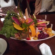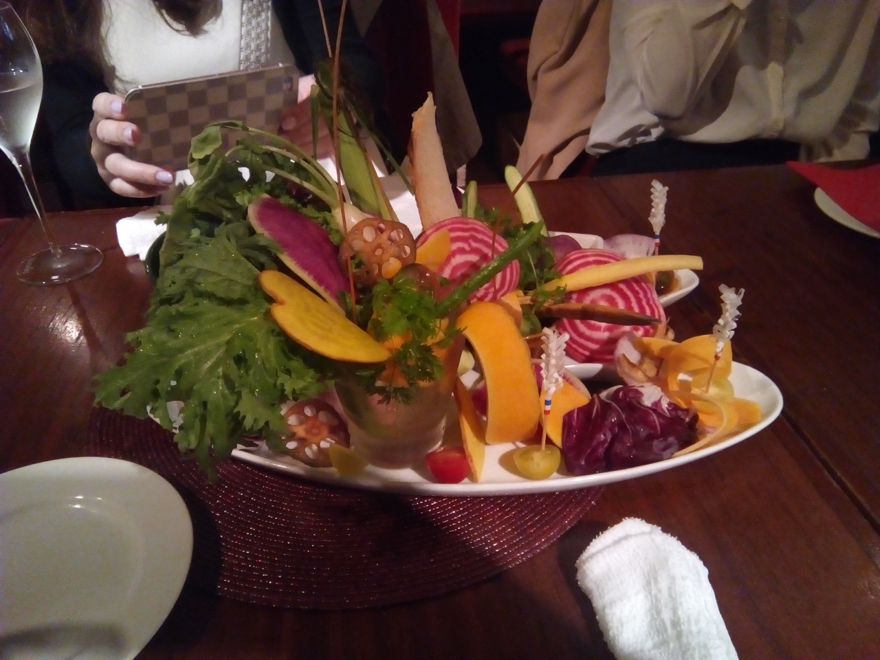 飲み放題付5000円のコースで予約しました。はじめに出てきたバーニャカウダーには感動!野菜ソムリエ協会認定レストランとして、野菜の料理に力を入れているそうで、まずは盛り付けが美しい。ソースも3種類ついて、鮮度の良いたくさんの種類の野菜がが出てきました。