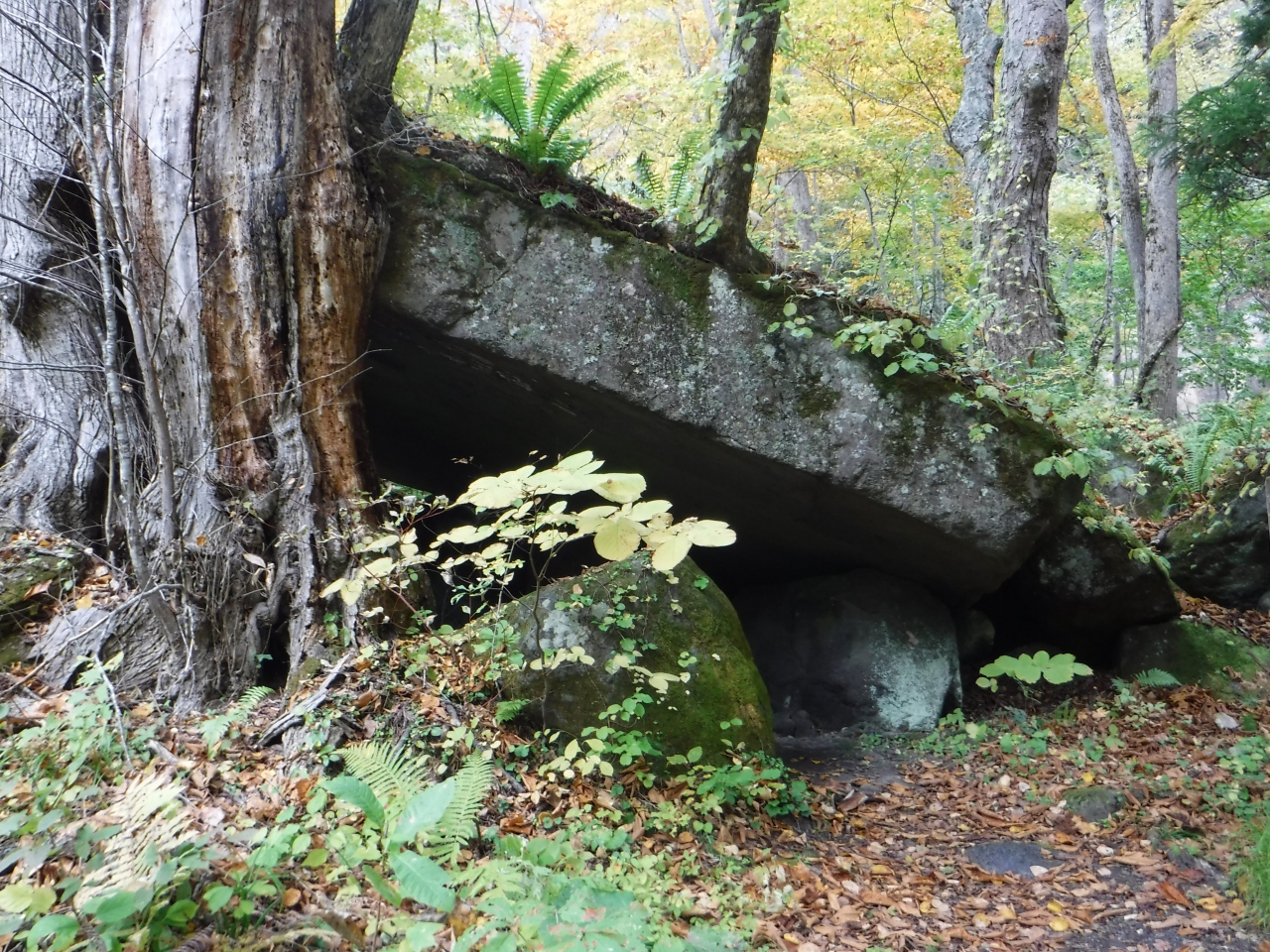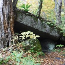 石ヶ戸休憩所から遊歩道に入ると、程なく石ヶ戸がありました。大きな一枚岩が倒れて(?)苔むしている・・・自然の地層の岩で平らなのかな、それとも切り出したのかな・・・正直それだけの感想でした。この岩に伝説があるなんて不思議な感じです。