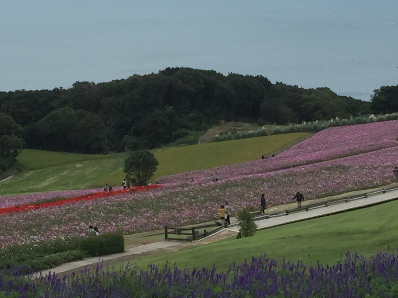 花便りはコスモスがどこも見ごろというのが多く、一面のコスモス畑というのがよくある。あわじ花さじきも毎年秋は広大な敷地にコスモスが植えられる。丁度サルビアと重なりコスモスとサルビアの花のコントラストが美しい。ここの特徴は起伏のある土地だから展望台から見るのも含め、見渡せるところが良いです。