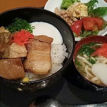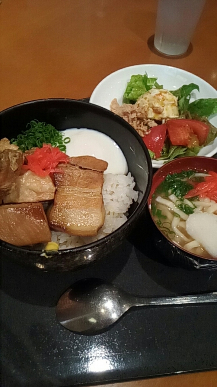 アスナル金山の二階にある沖縄料理のお店です。ランチメニューのラフテー丼に、サイドメニューのミニサラダと同じくサイドメニューの沖縄そばをいただきました。サイドメニューはそれぞれプラス100円です。美味しかったのですが、丼がそれなりにボリュームがあったのでライス少なめでもよかったくらいでした。
